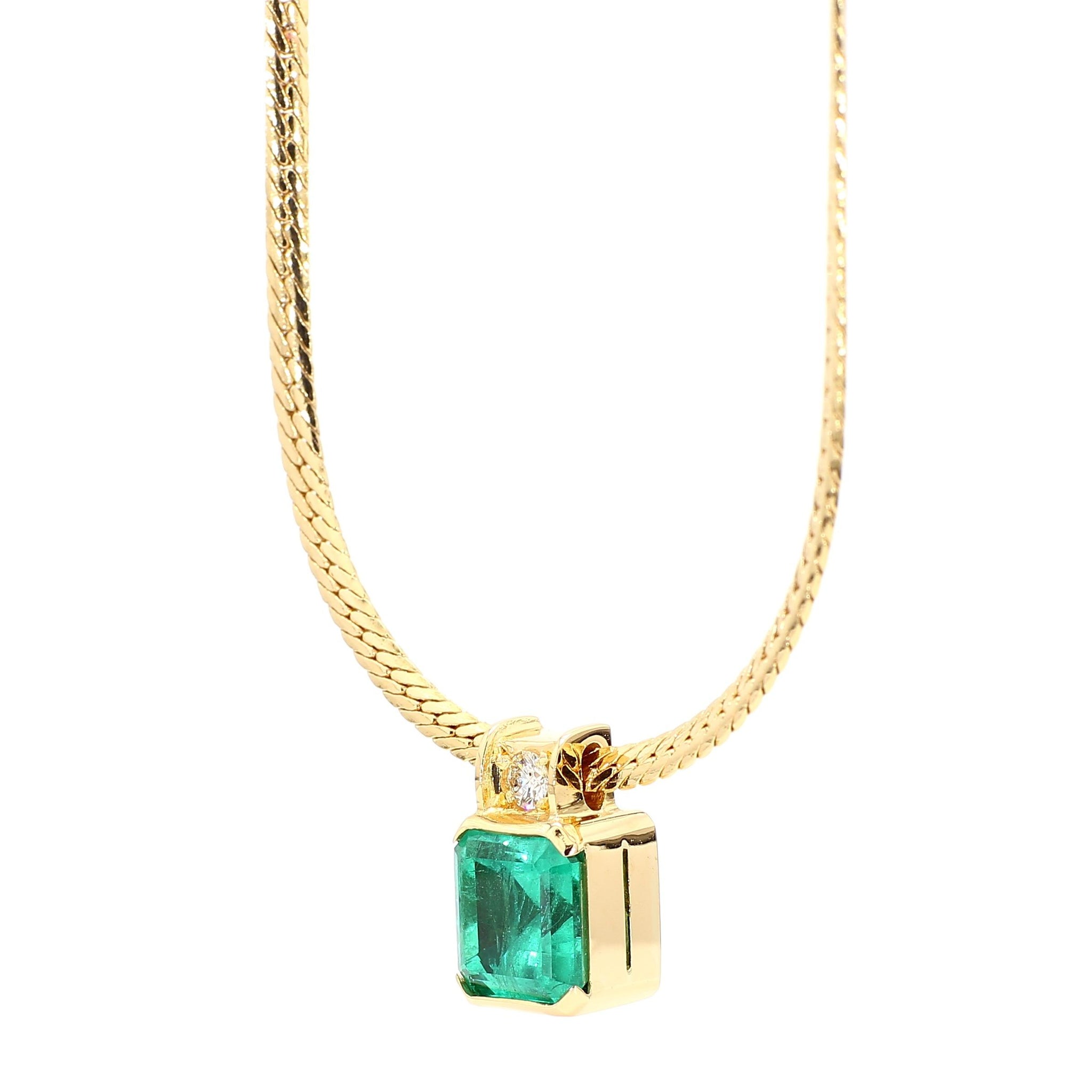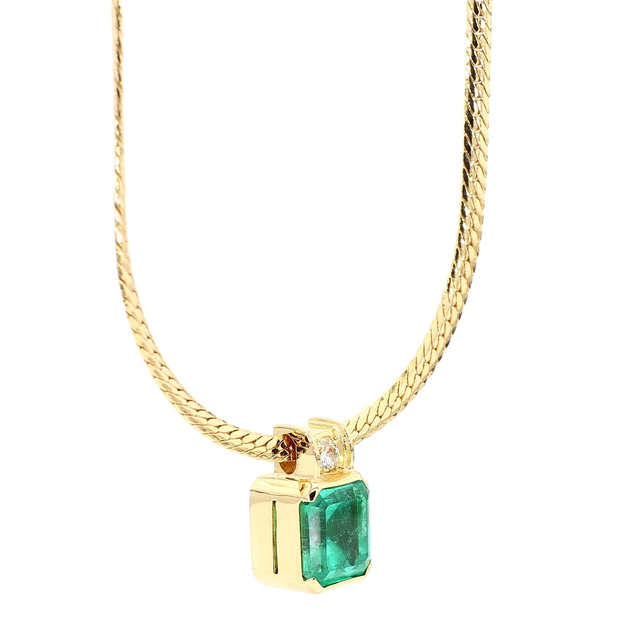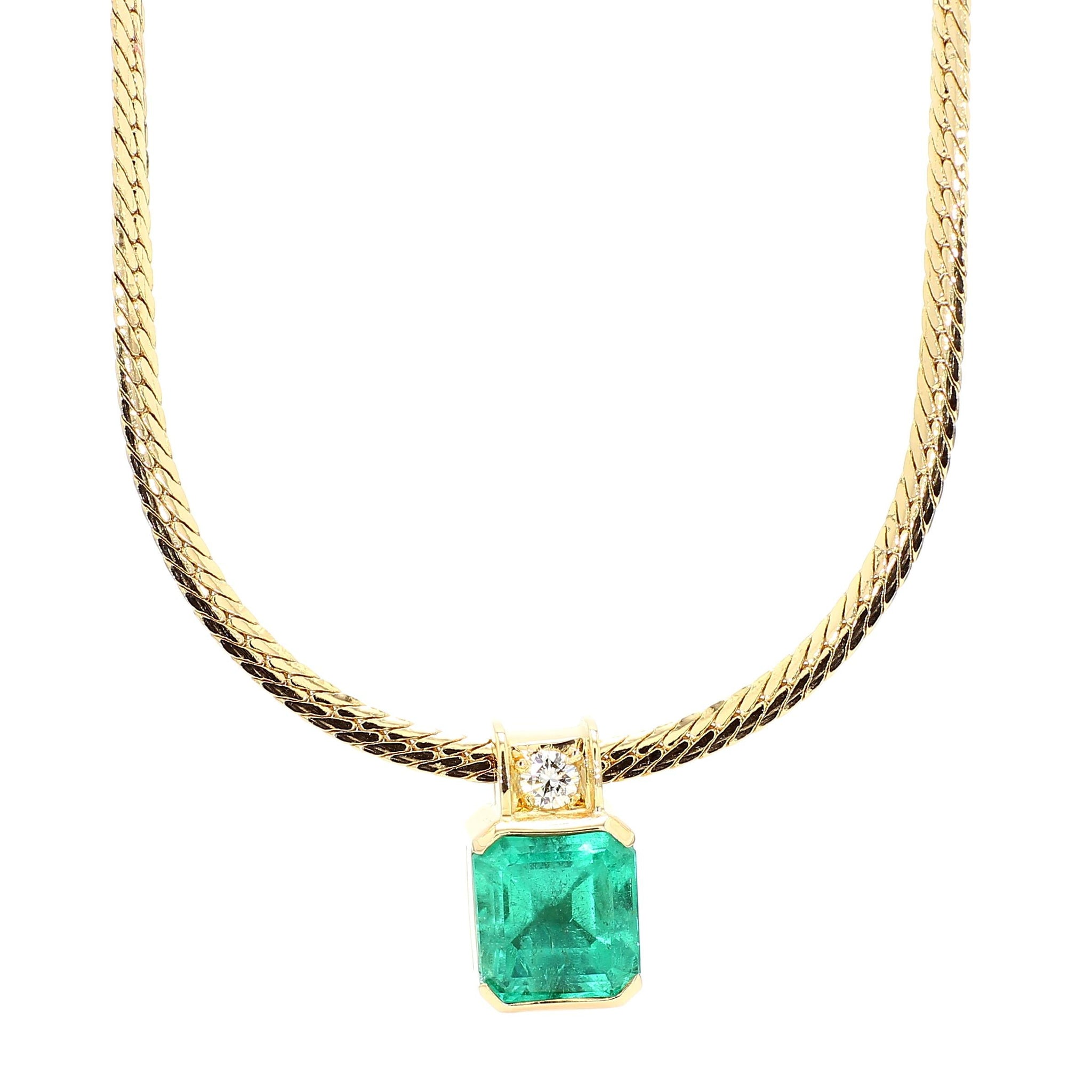 Natural 4.36 carat Colombian emerald cut vivid green emerald pendant in an 18K yellow gold full bezel setting with a single round brilliant diamond set in the bail, suspended on a 2.5mm 18K yellow gold herringbone chain.