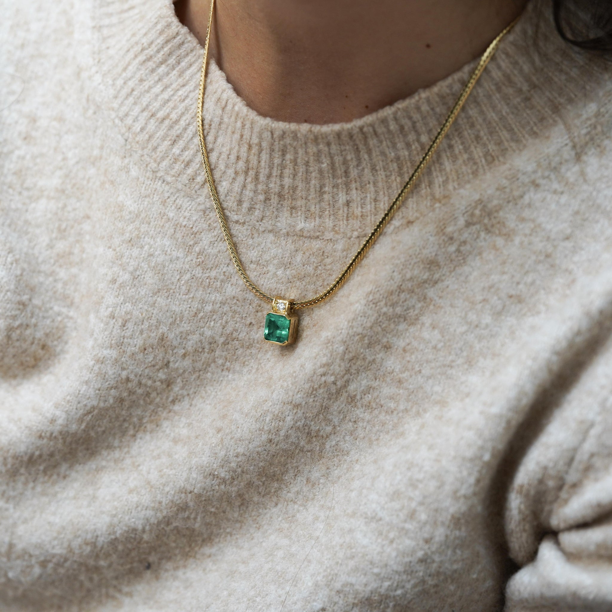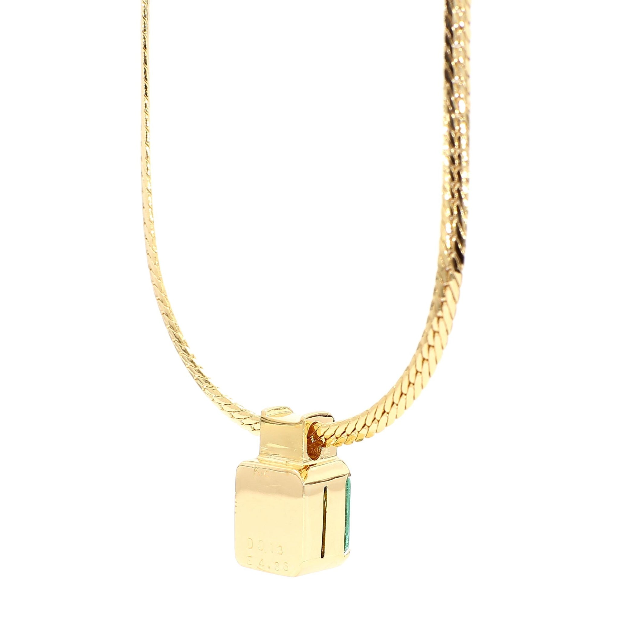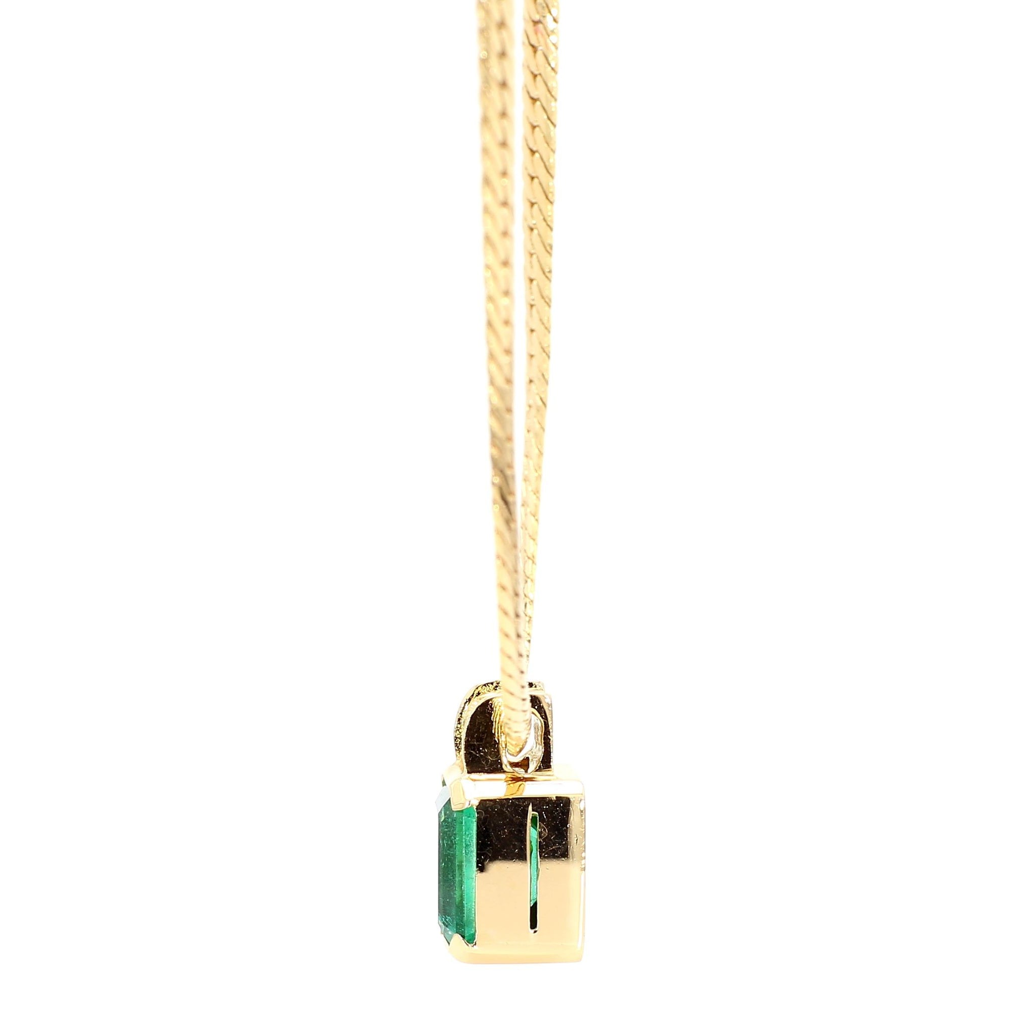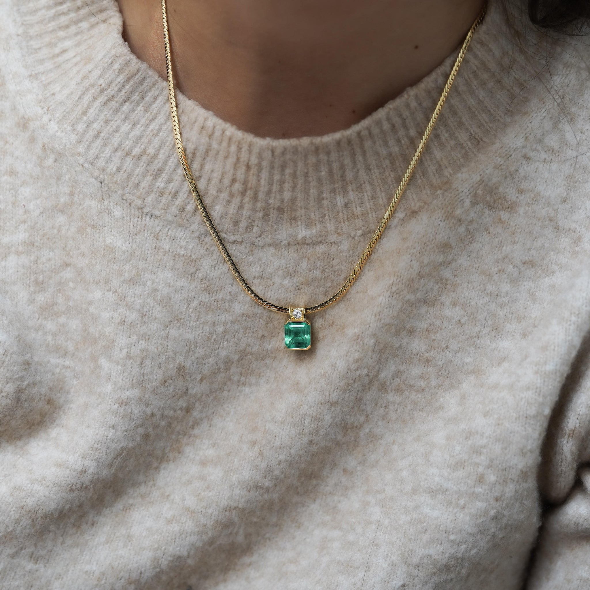 Natural 4.36 carat Colombian emerald cut vivid green emerald pendant in an 18K yellow gold full bezel setting with a single round brilliant diamond set in the bail, suspended on a 2.5mm 18K yellow gold herringbone chain.