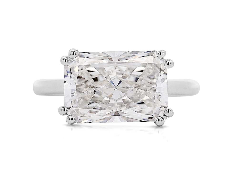 Elongierter Radiant-Schliff-Diamant mit dem perfekten Längen-Breiten-Verhältnis, gefasst in einer Ost-West-Fassung, die einer klassischen Solitär-Optik eine moderne Note verleiht und so ein mutiges Statement setzt. Dies ist ein Ring, den sonst niemand hat. Entworfen für die moderne Zeit, verkörpert dieser Ring eine minimalistische Ästhetik und bietet gleichzeitig Nachhaltigkeit durch seinen im Labor gezüchteten Diamanten. Perfekt, um die wertvollsten Momente des Lebens zu feiern, vereint dieser Verlobungsring ethischen Luxus mit herausragender Schönheit.