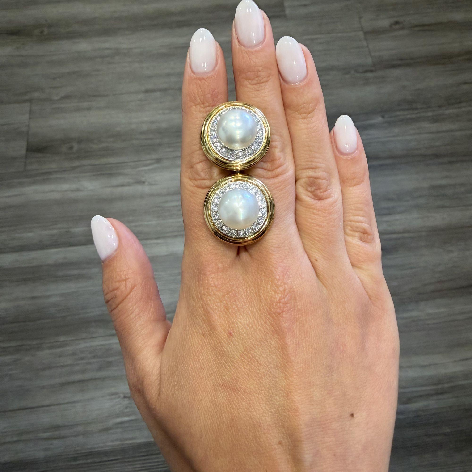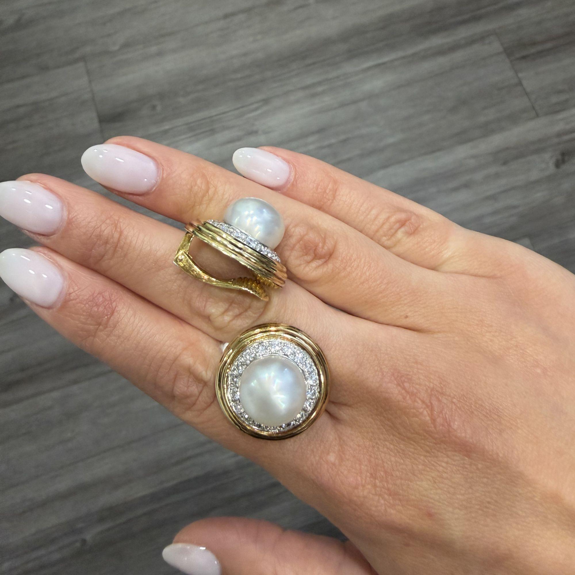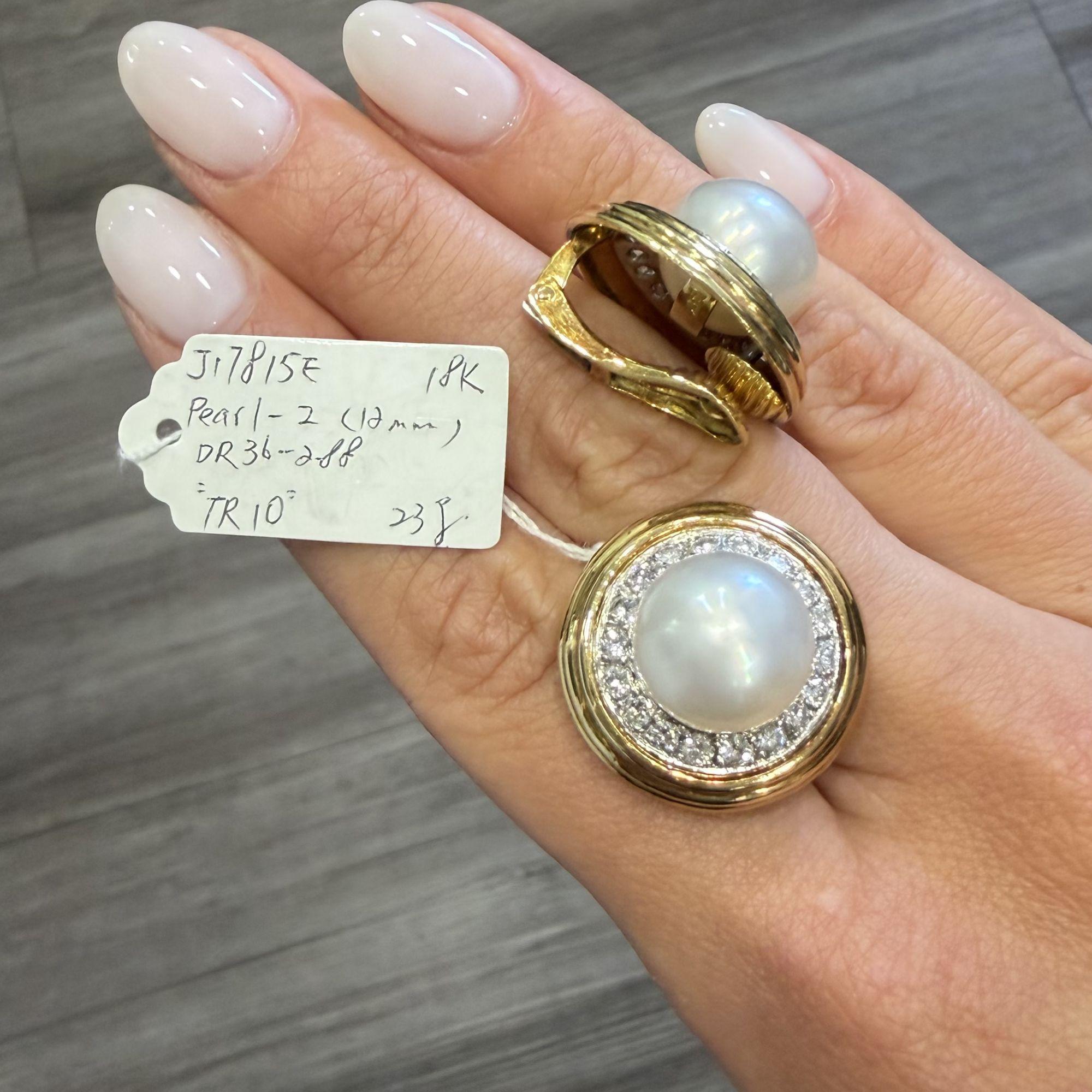 The first earring is a dramatic circular disc in 18K yellow gold featuring a wide ribbed outer rim surrounding a white gold pave diamond inner halo that frames the 12mm south sea pearl at center — bold, geometric, and commanding. The second earring showcases the same 12mm south sea pearl nestled within a free-form organic textured bypass mounting in 18K yellow gold with accent diamonds along the sculptural wave form, giving it an artistic, nature-inspired character. Together the two earrings create a cohesive yet visually dynamic pair that blends structured glamour with organic elegance — a designer-level pairing that makes a powerful style statement.