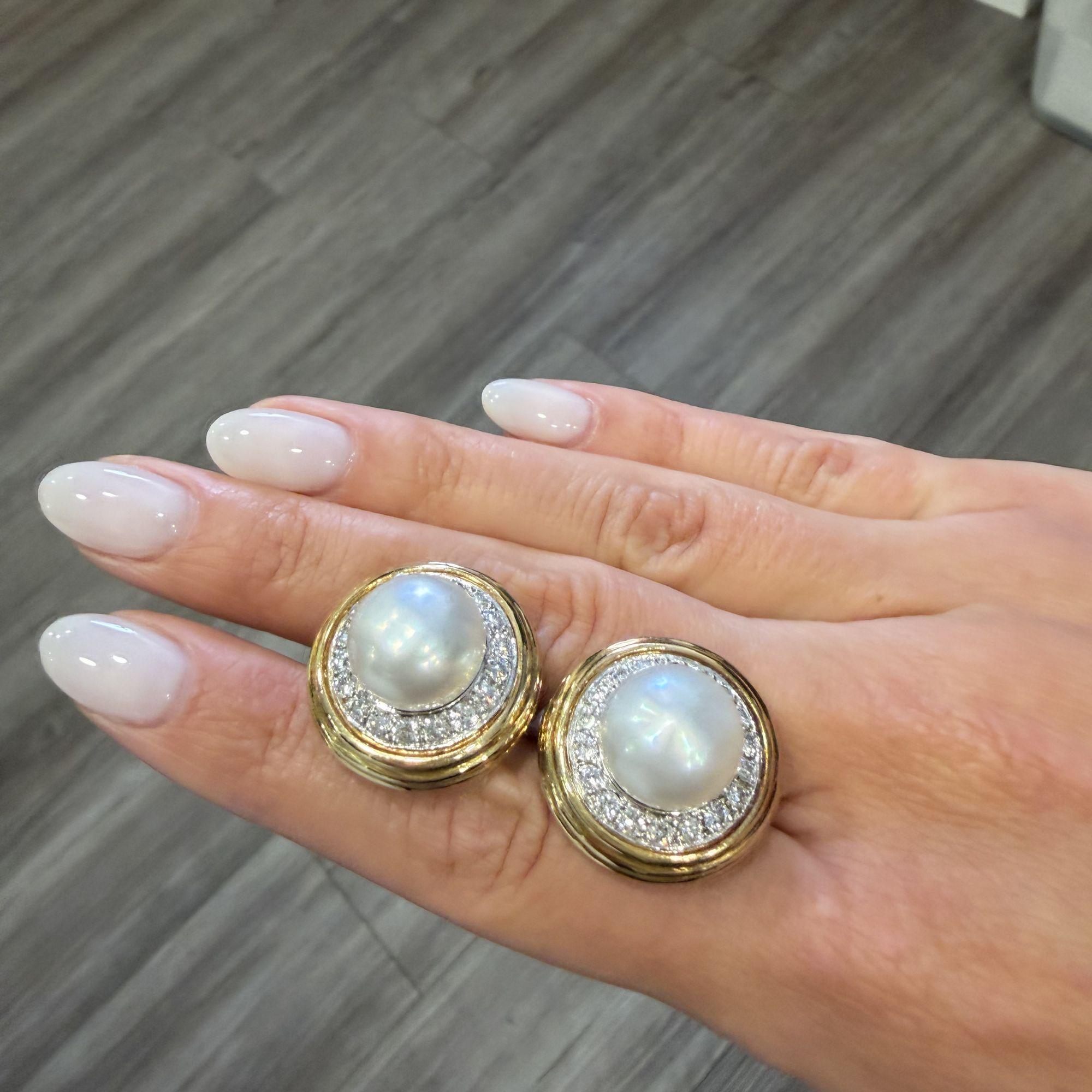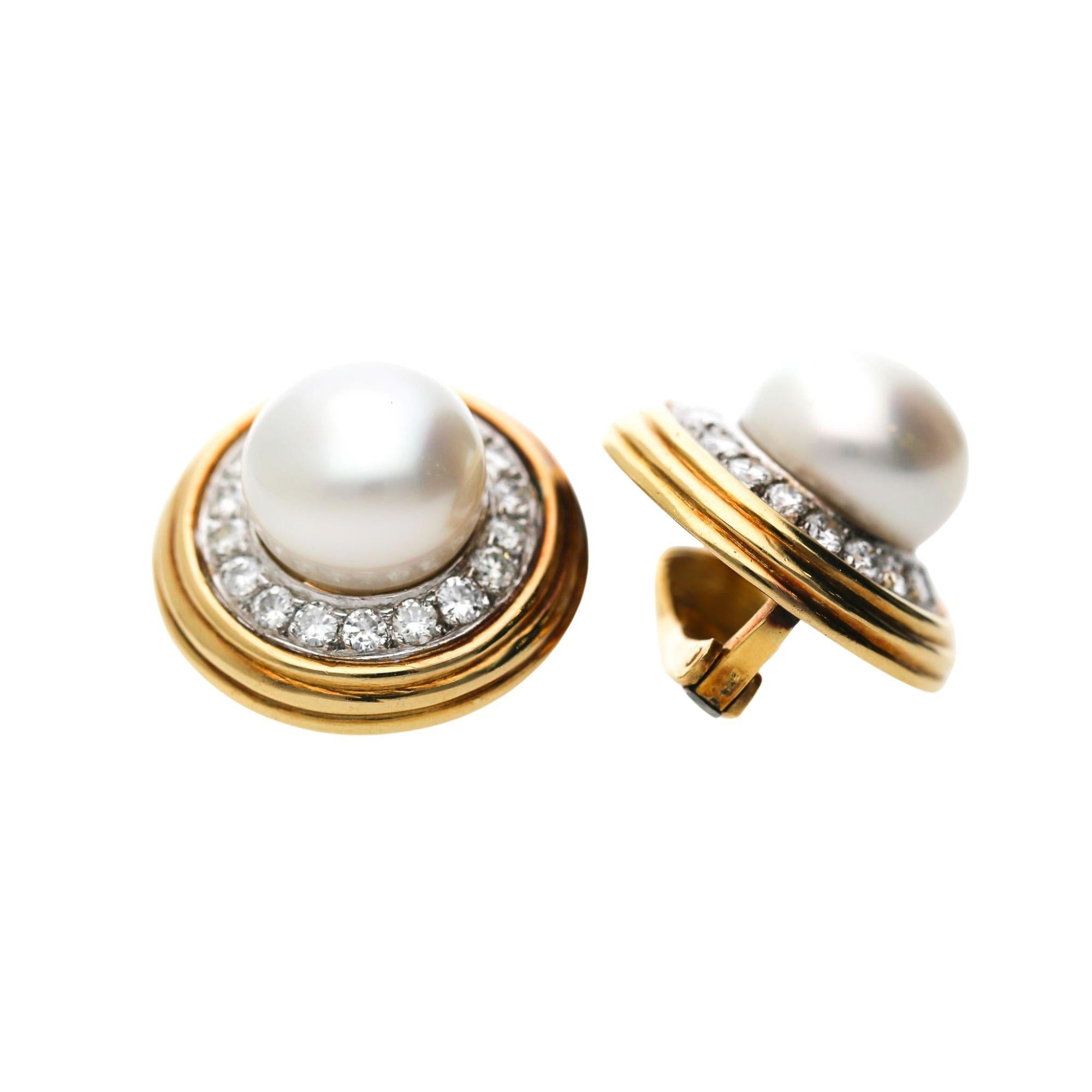 Each 12mm south sea pearl delivers exceptional luster with a white body color and a soft silver-blue overtone characteristic of the finest south sea cultured pearls. At 12mm, these pearls are considered large by industry standards, prized for their thick nacre and naturally brilliant surface that no artificial treatment can replicate. The 36 round brilliant diamonds totaling 2.88 carats provide a sparkling white frame around the disc earring's pearl, amplifying its glow and adding significant diamond weight to the pair. South sea pearls of this size paired with nearly 3 carats of diamonds represent a level of luxury reserved for serious collectors and fine jewelry connoisseurs.