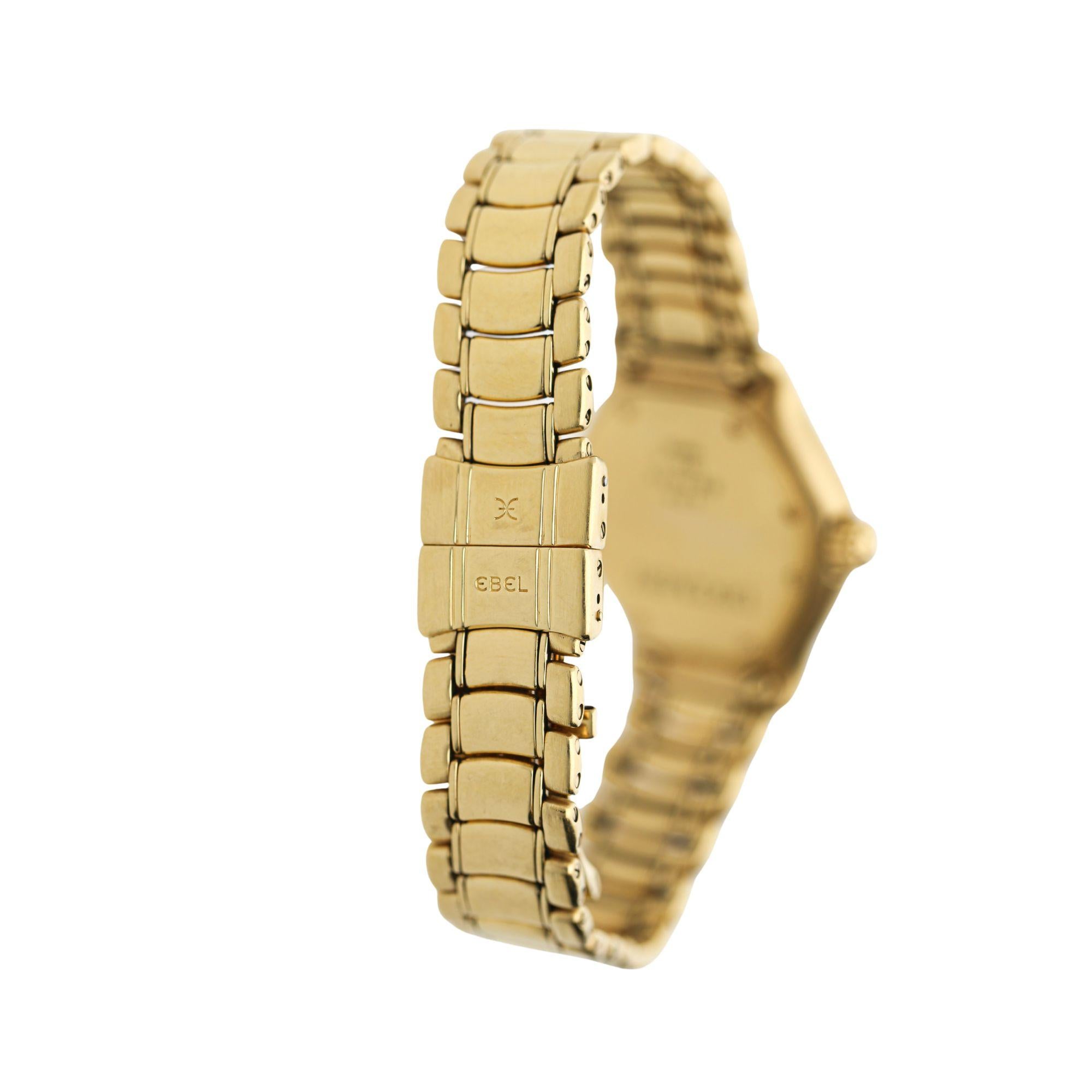 Ebel's Discovery collection represents the brand's signature seamless case-to-bracelet integration philosophy. At 106.28 grams in solid 18K yellow gold with ruby and diamond bezel, this watch functions as both timepiece and fine jewelry. The Swiss quartz movement ensures accurate timekeeping.