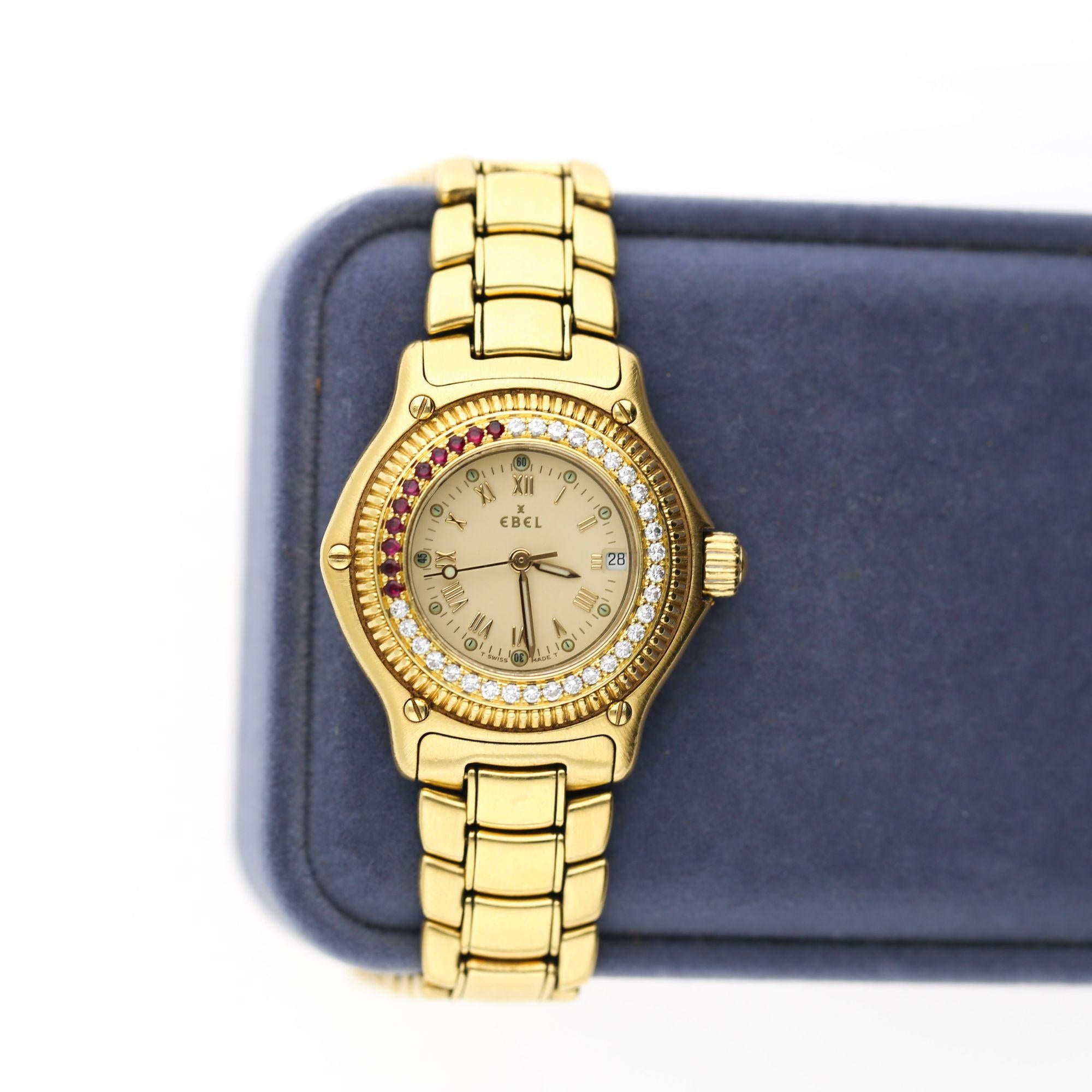 Ebel Discovery 139 with a rare factory set ruby and diamond bezel. 28mm Ladies quartz watch in 18K yellow gold featuring cream Roman numeral dial with fluted bezel set with 11 natural rubies and 29 round brilliant diamonds. Integrated polished yellow gold bracelet, weighing 106.28 grams total.