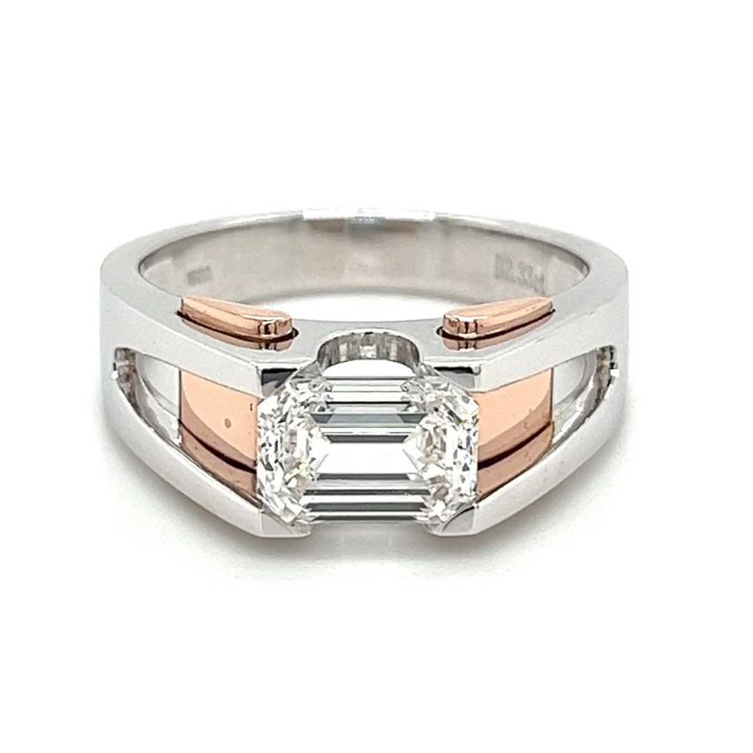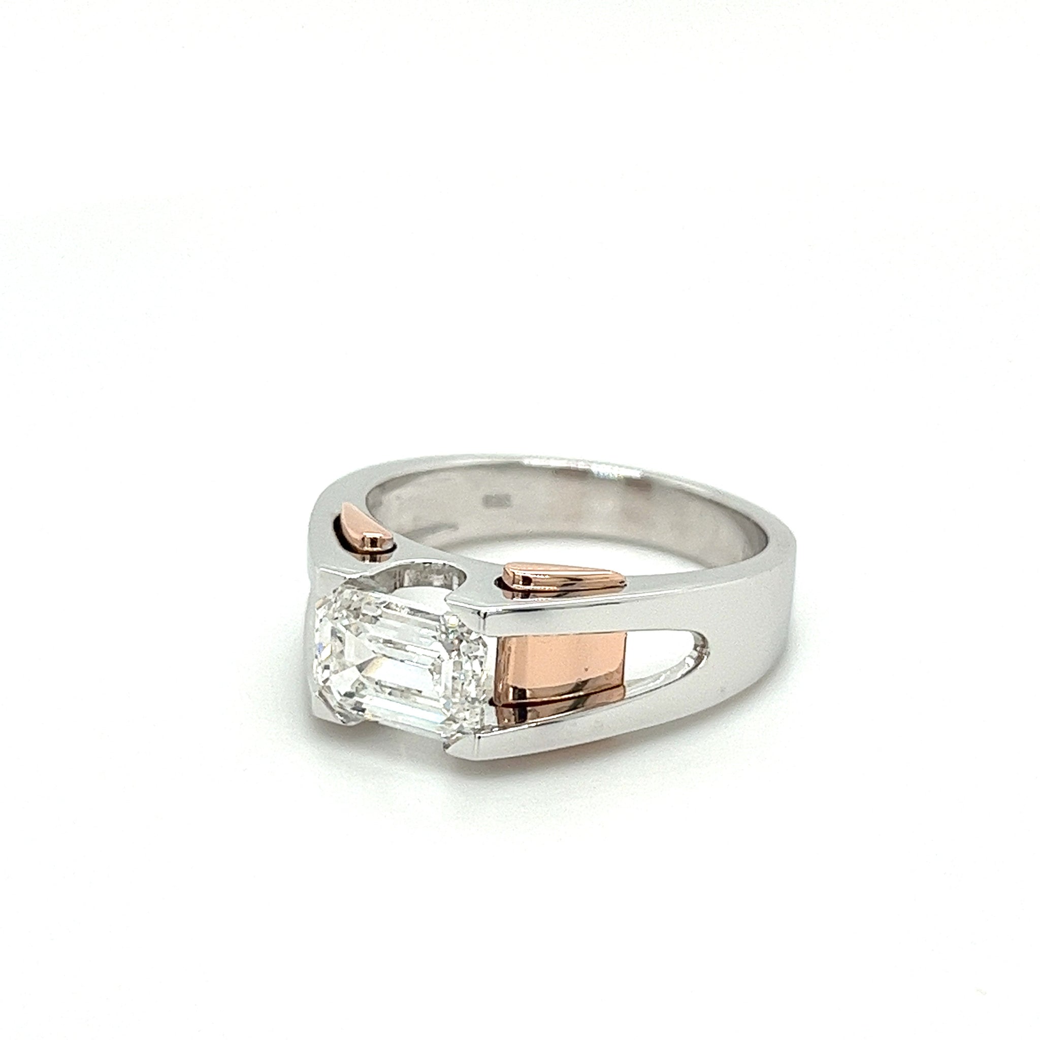 2.87 quilates, corte esmeralda, color G-H, claridad VVS2-VS1, diamante creado en laboratorio engastado en oro de 14k de dos tonos: rosa/rosado y blanco.