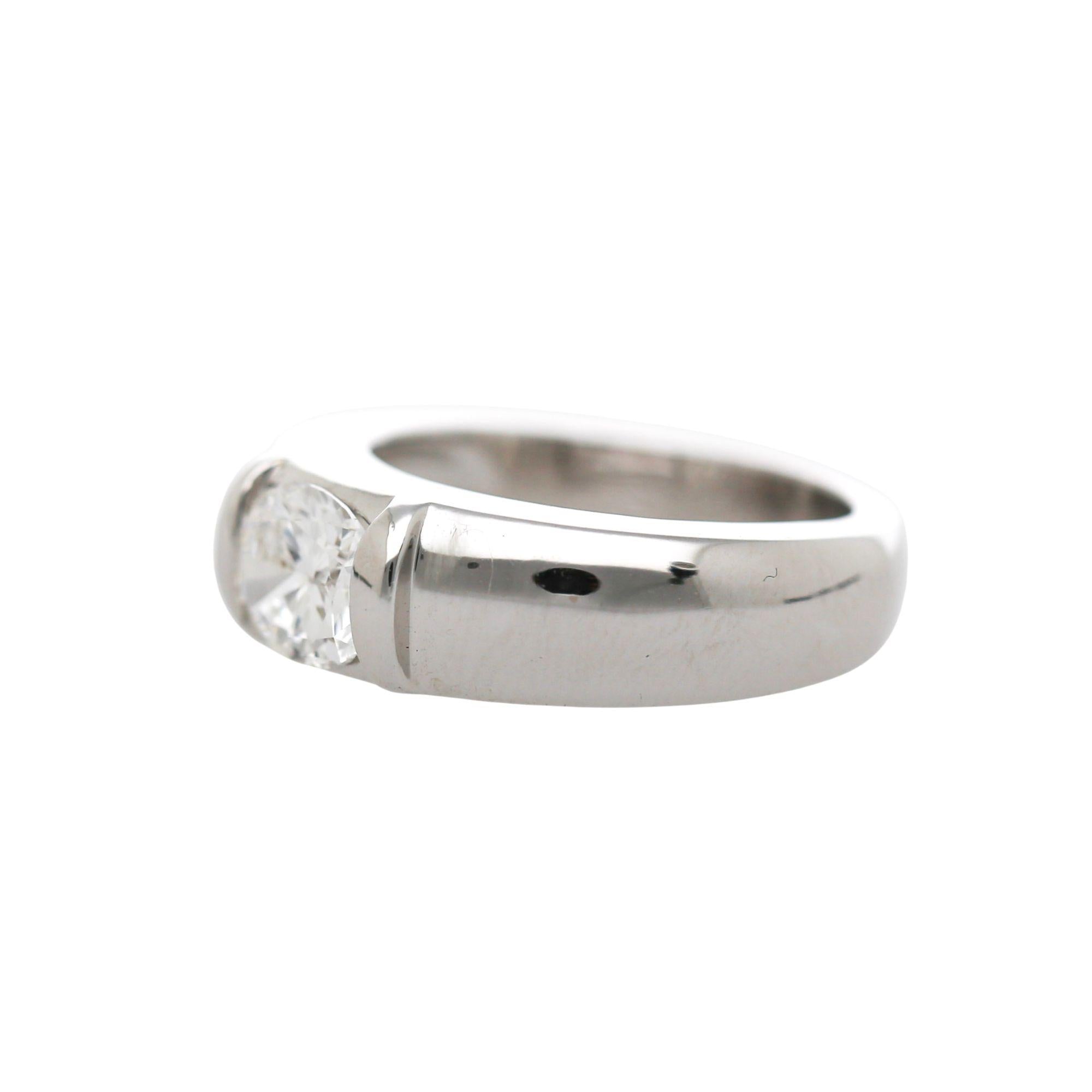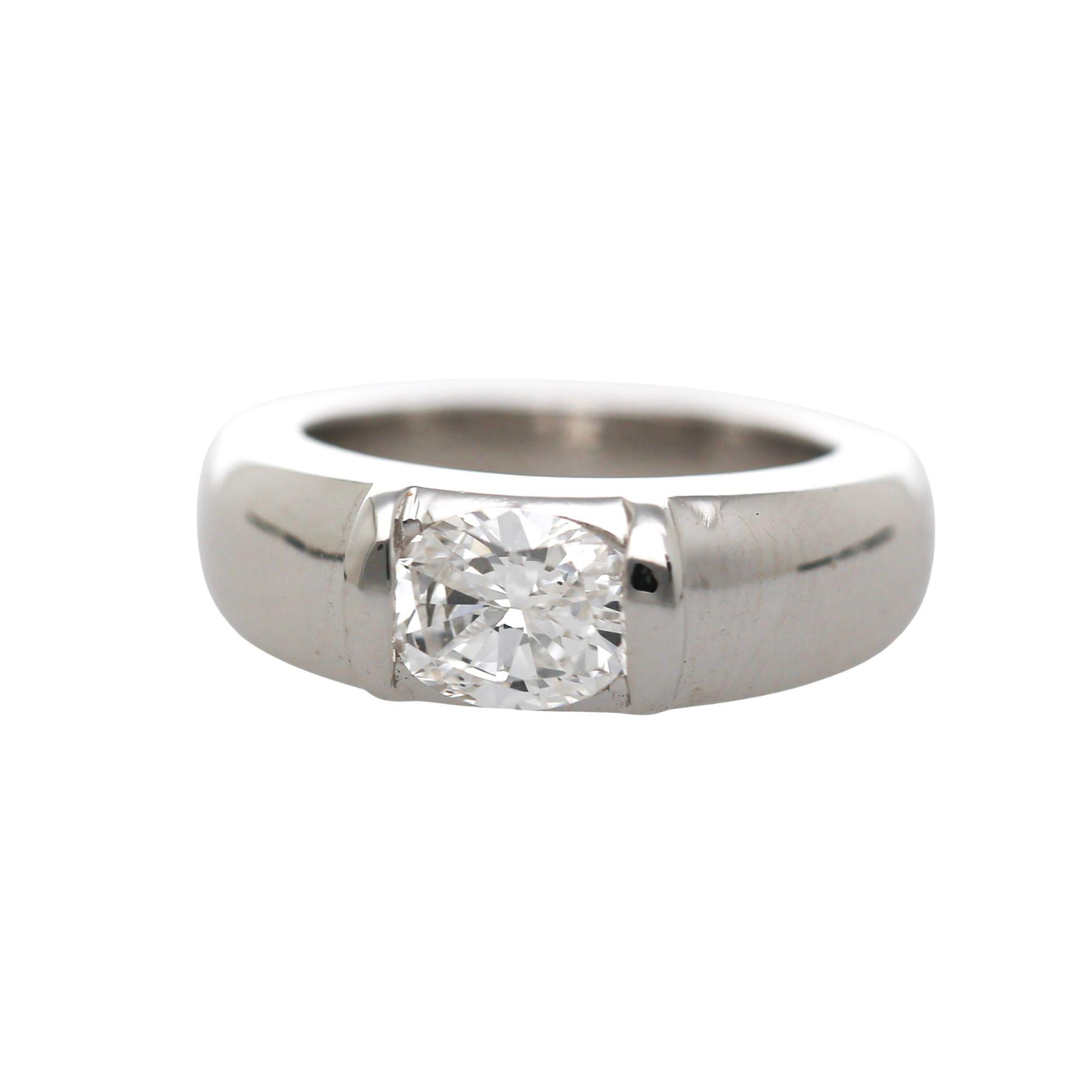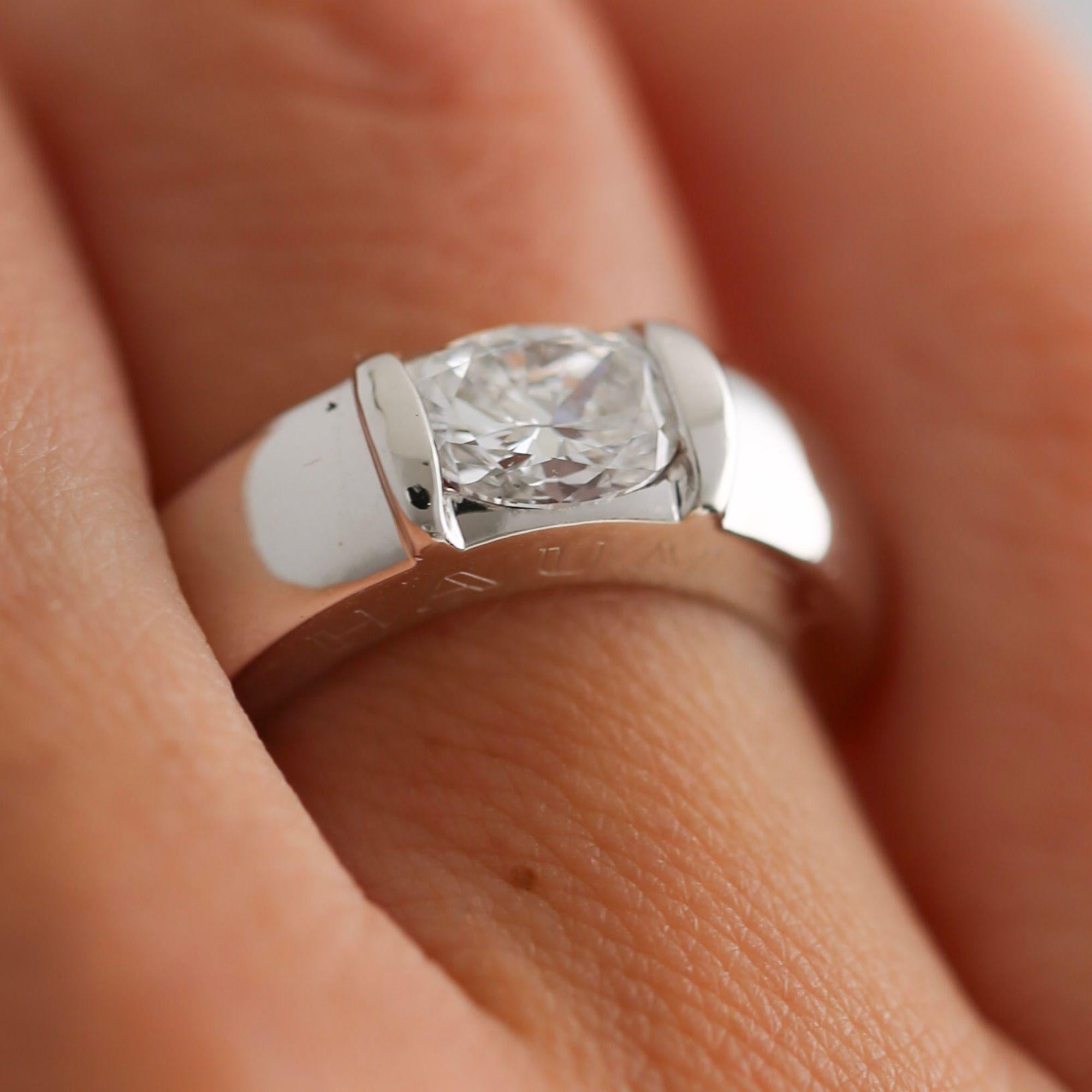 Chaumet Paris signed 18K white gold solitaire east west ring featuring a 1.01 carat GIA-certified oval-cut D color diamond. Set in a sleek tension-style setting with a bold 6.3mm high-polish band that lets the stone appear to float within the gold. The ring is a size 5.25, adjustable. Signed CHAUMET on the ring shank, Chaumet Pairs, 750, and serial numbered.