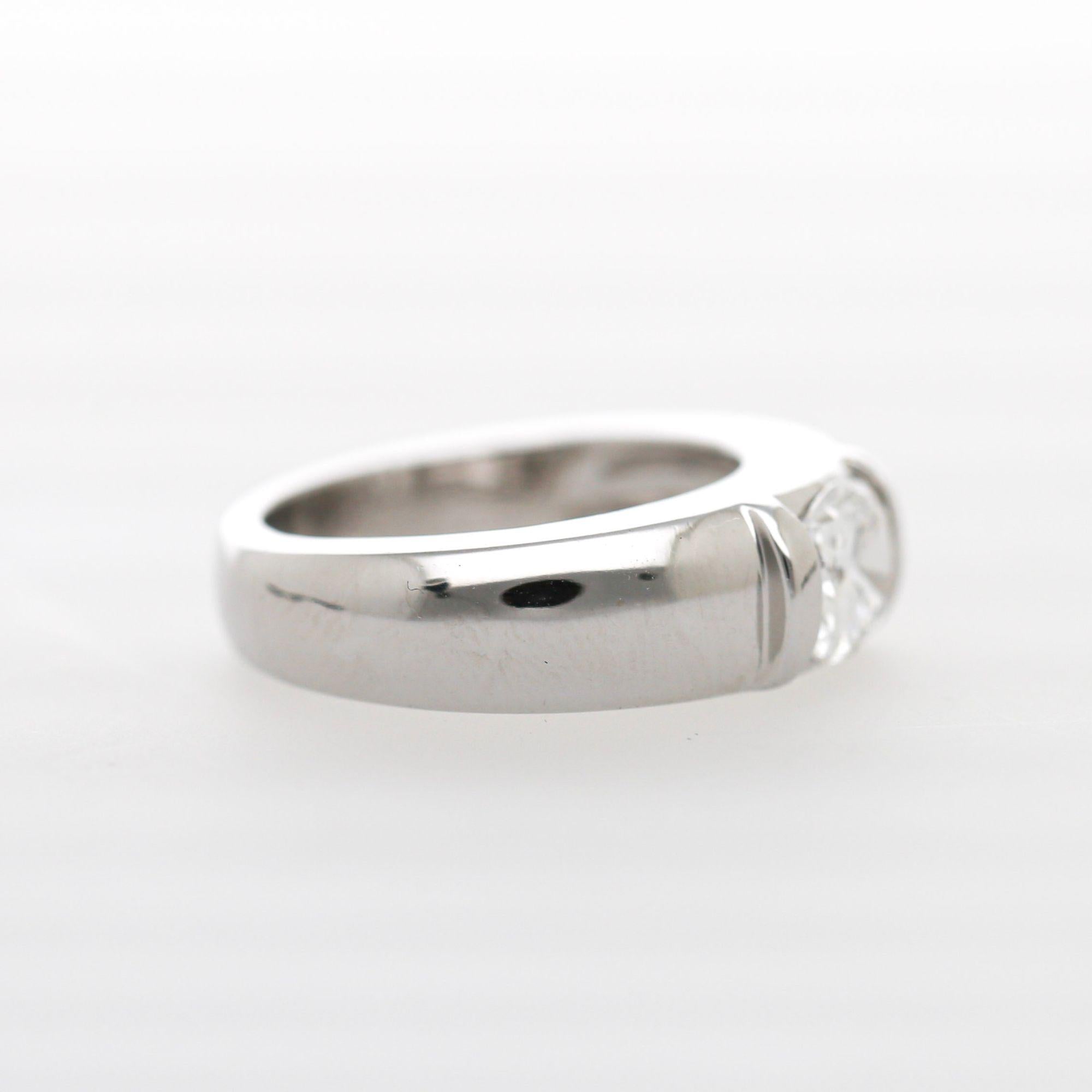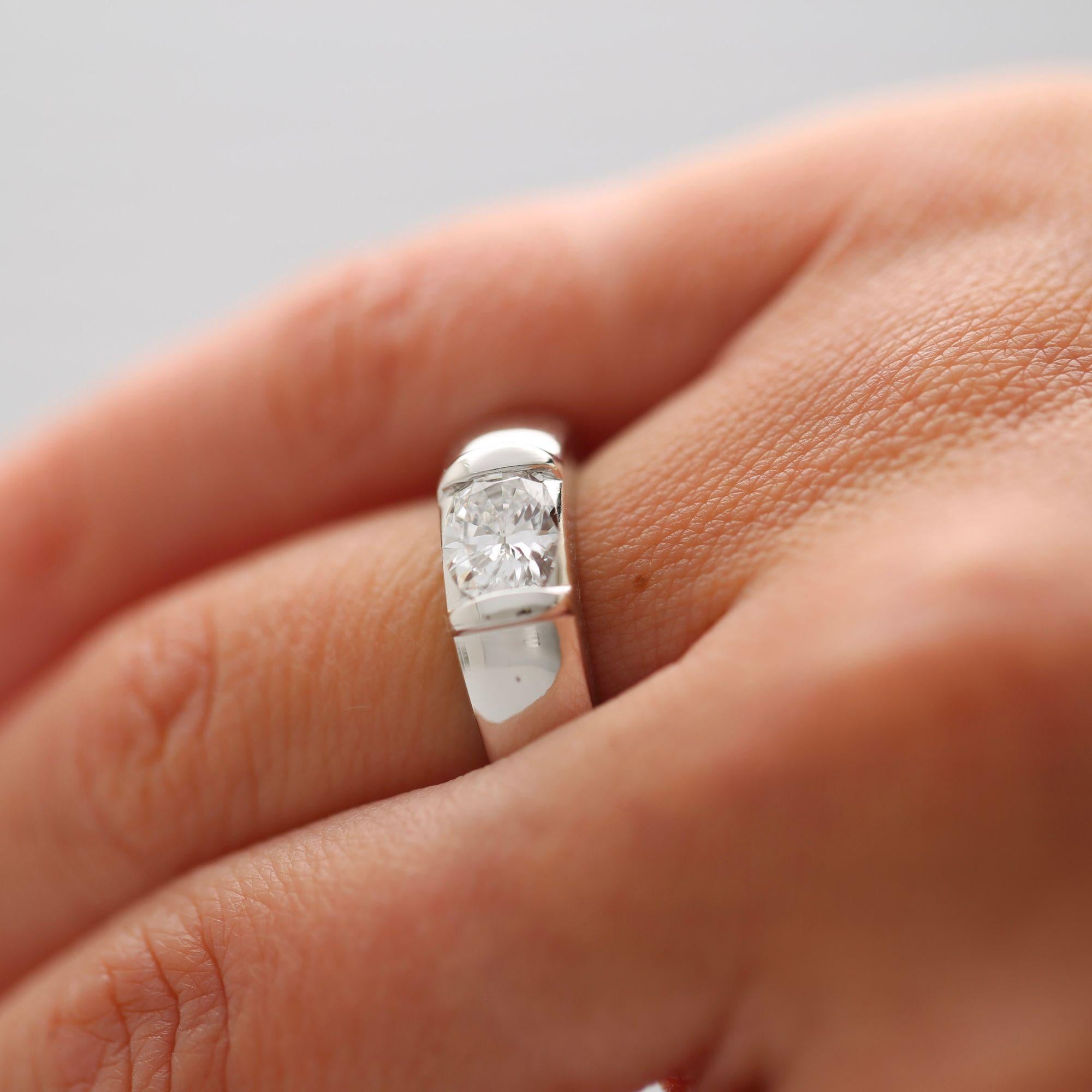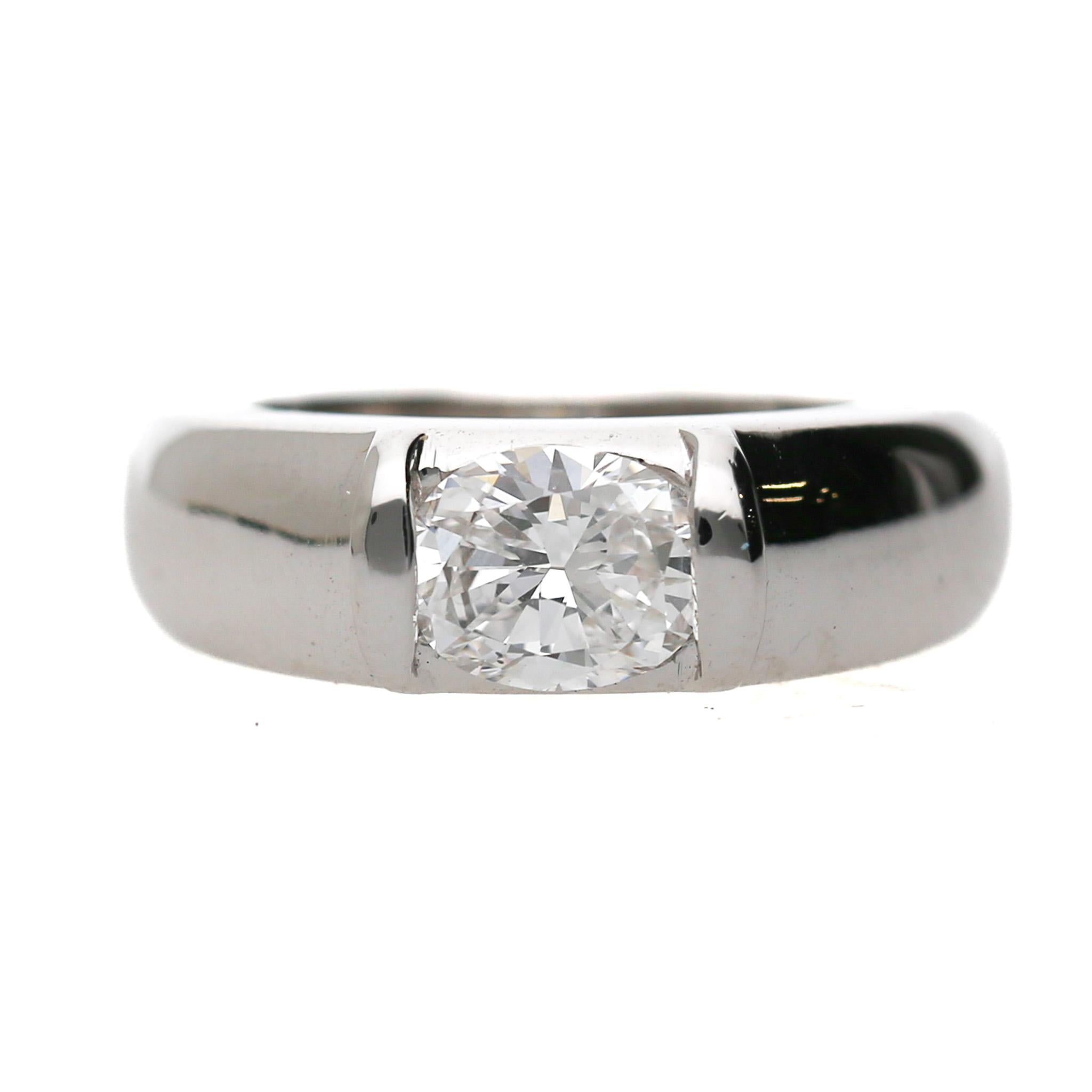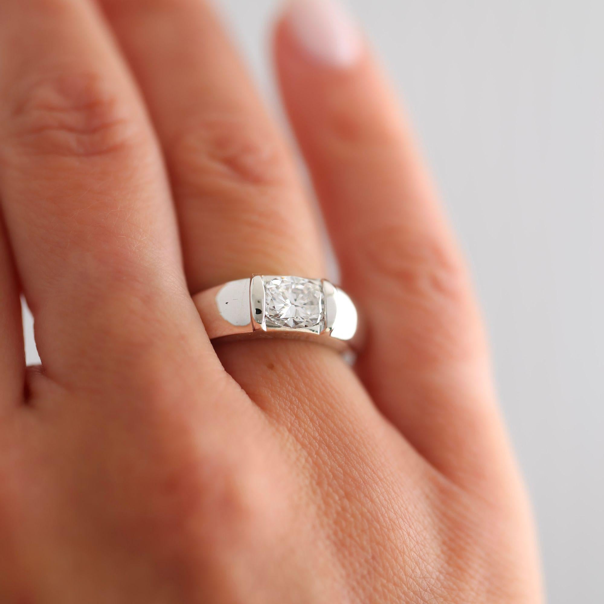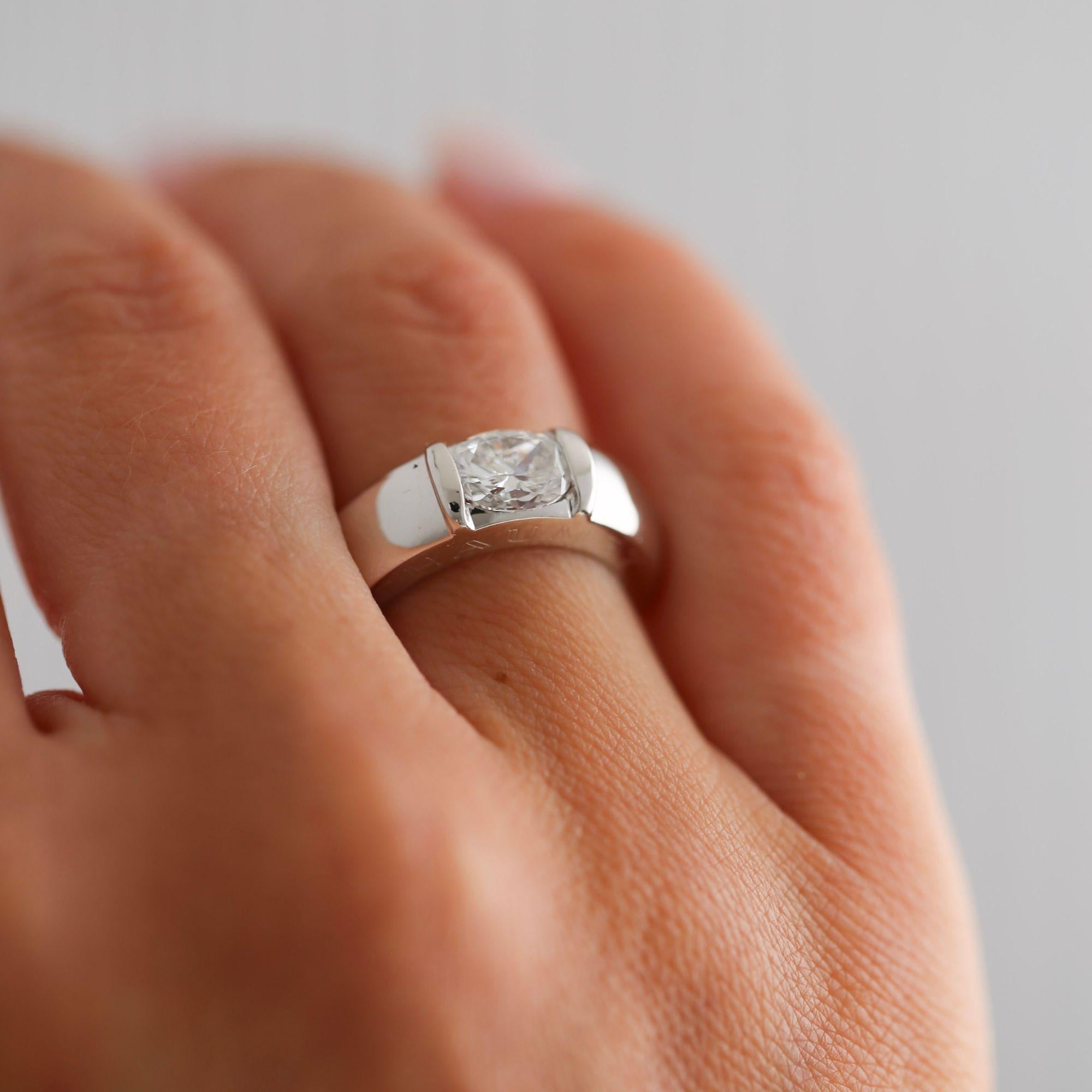 The setting is a masterpiece of minimalist modernism. A thick domed 6.3mm 18K white gold band with no visible prongs or bezels, relying entirely on precision tension of the metal walls to hold the cushion-cut diamond securely in place. This tension mounting style was a signature hallmark of Chaumet's contemporary design language, requiring extreme precision in manufacturing to ensure the stone is gripped at exactly the correct pressure to be both secure and visually floating. The result is a ring where the diamond appears suspended in mid-air against the high-polish white gold, creating a striking architectural statement that is as modern today as the day it was made.