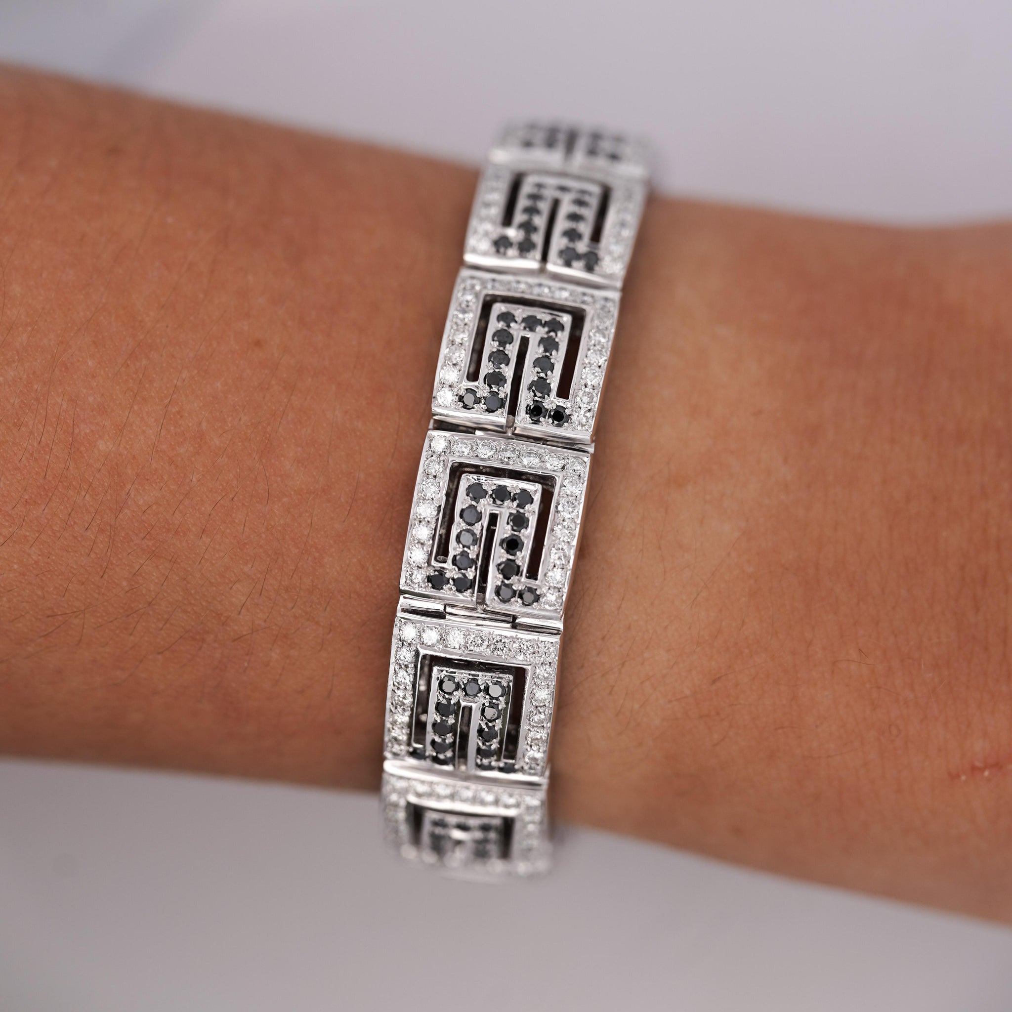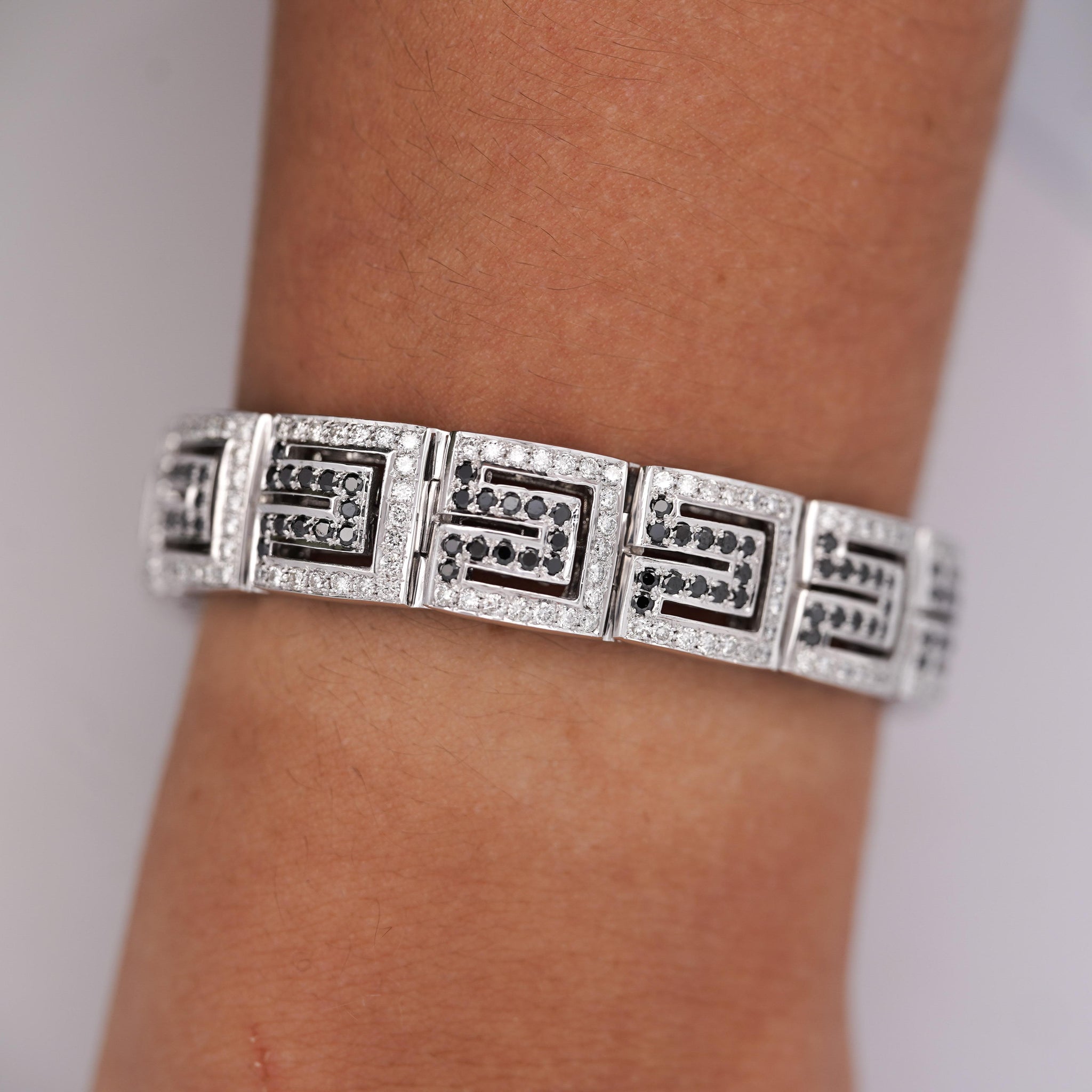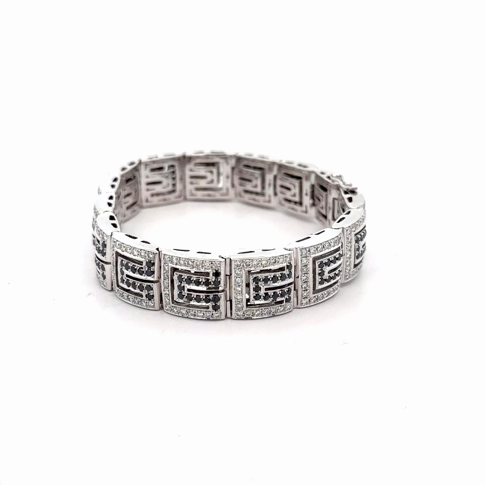 Design & Construction The bracelet features repeating rectangular panels showcasing angular Greek key or meander motif created through contrasting black and white diamond placement. Each panel contains a central geometric design with black diamonds forming rectangular patterns surrounded by frames of near-colorless white diamonds. The 18K white gold construction provides neutral backdrop enhancing the stark color contrast between black and white diamonds. The articulated panel design allows flexible wrist conformity while maintaining the geometric pattern's visual continuity. Hidden box clasp with integrated safety catch provides secure closure without disrupting the bracelet's clean modern aesthetic.