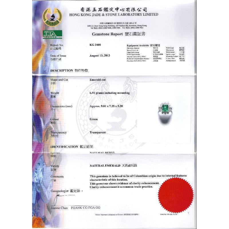 Complemented by 4 emerald-cut diamond side stones beside 10 round brilliant-cut diamonds. All of which are F-G color and VS clarity. This ring is unmistakably valuable to even the untrained eye.