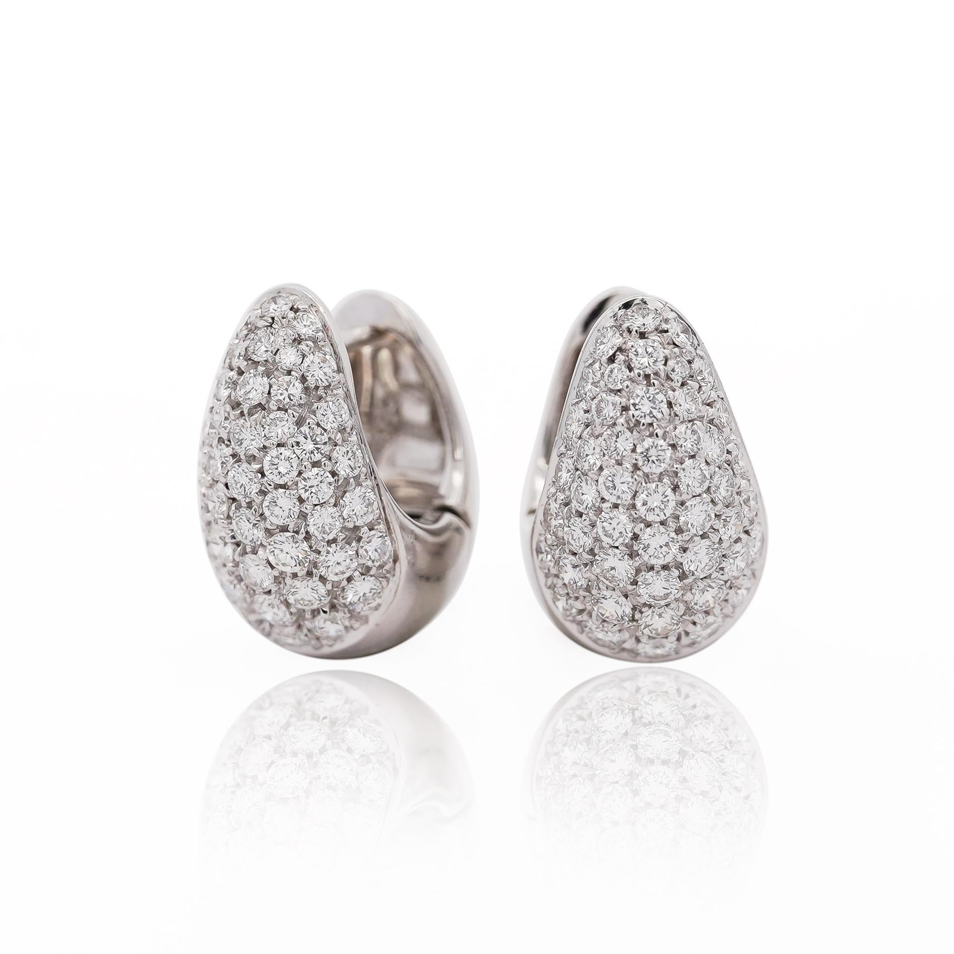 The tapered teardrop silhouette creates elegant proportions with maximum surface coverage for continuous diamond sparkle. Round brilliant diamonds are micro-pavé set across the entire visible surface, creating a seamless dome of brilliance. 18K white gold mounting provides a secure stone setting while maintaining a lightweight profile at 10.87 grams per pair.