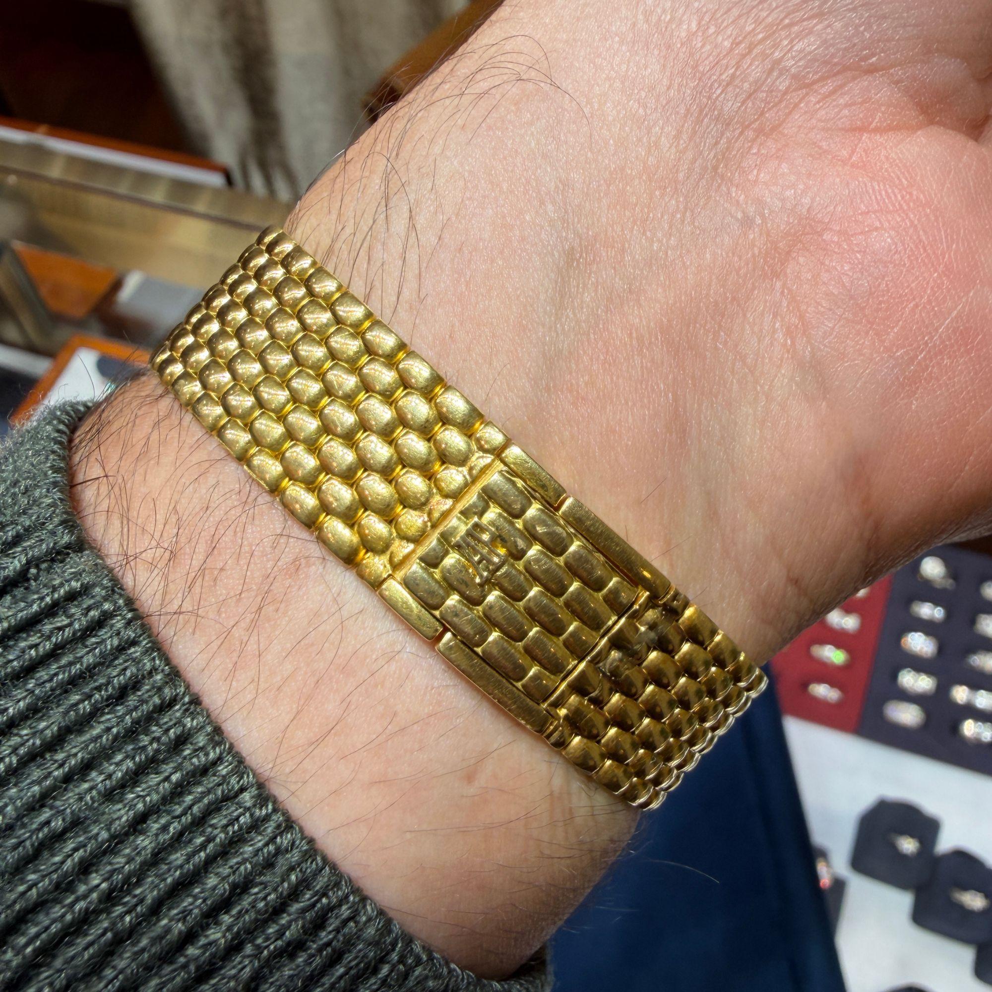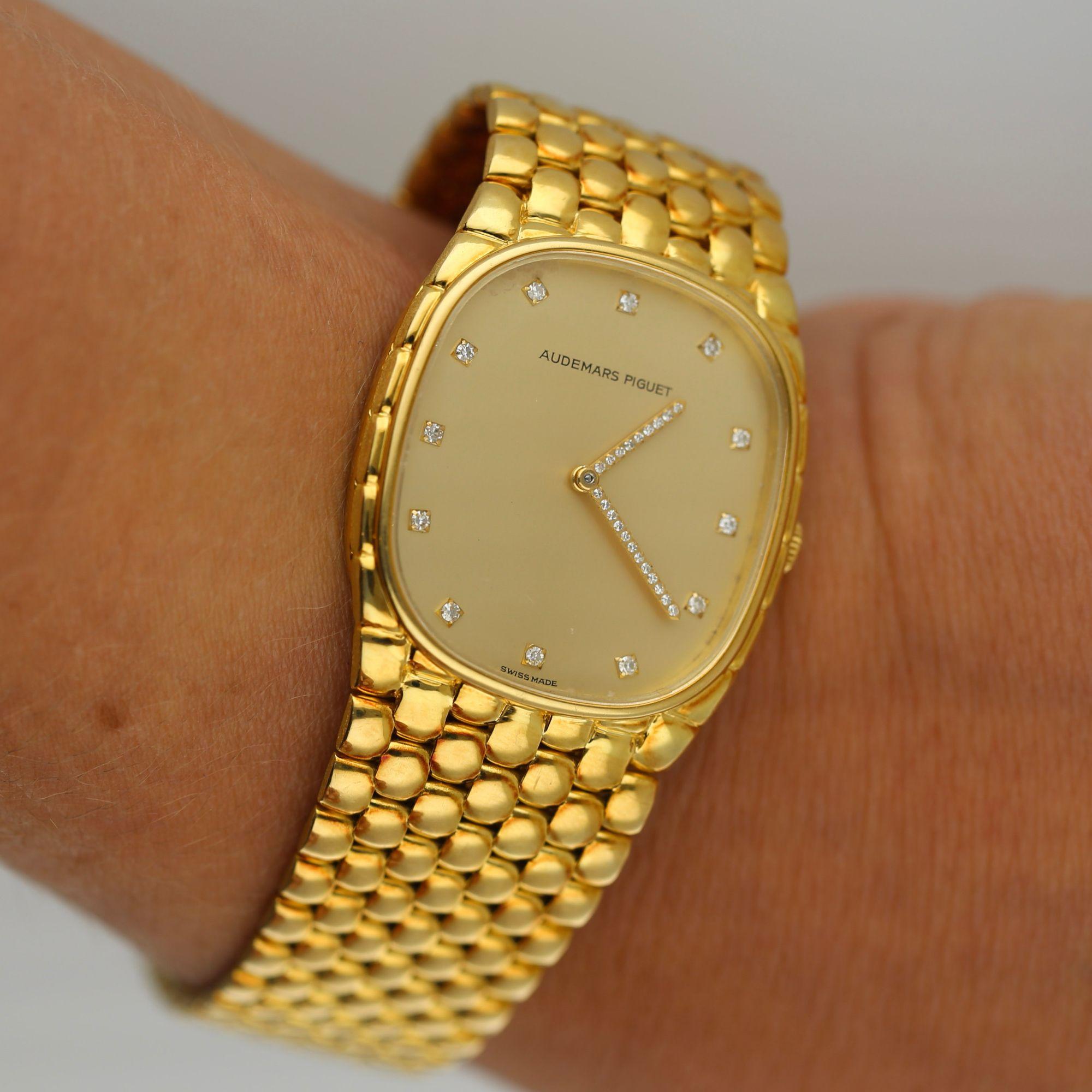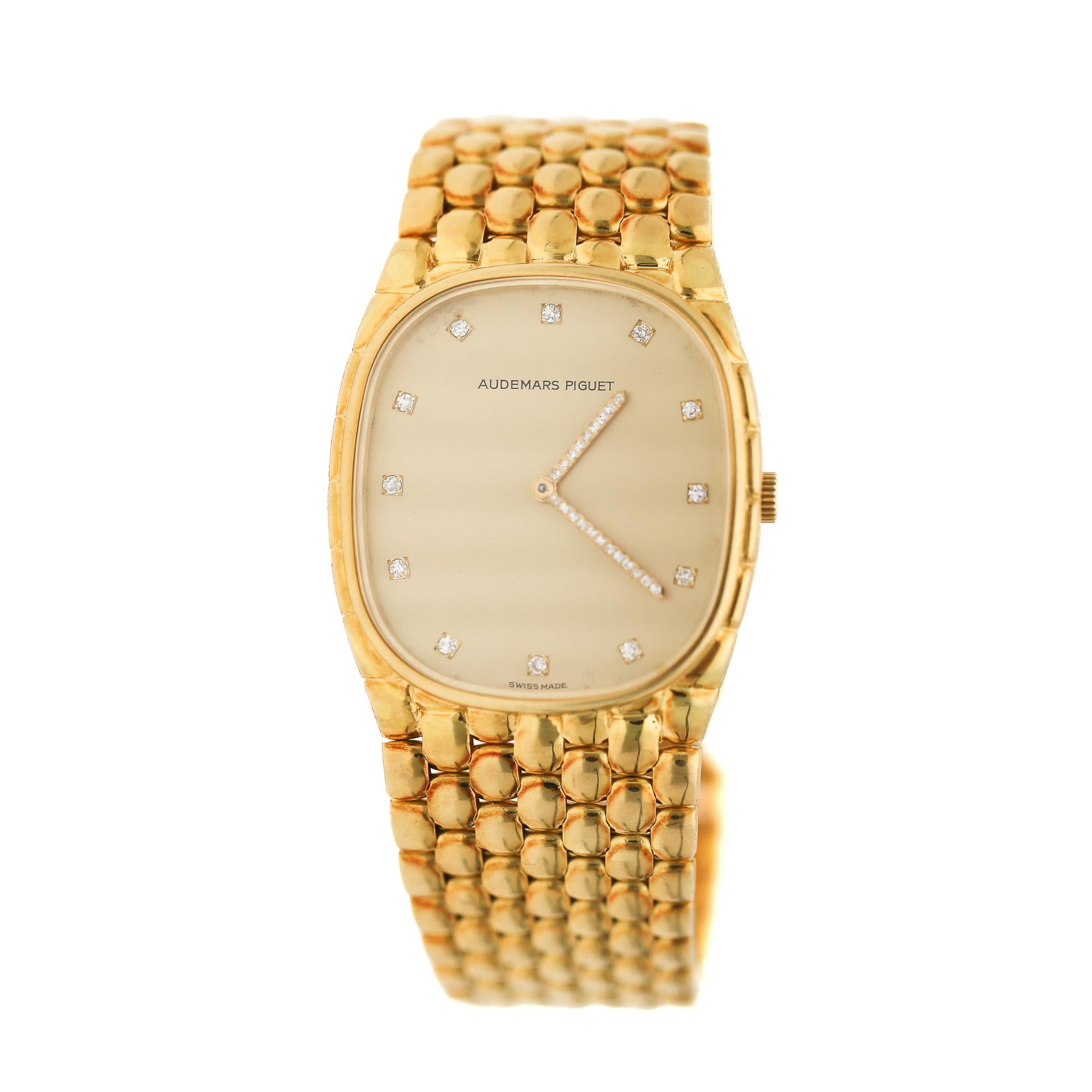 Vintage Audemars Piguet Cobra dress watch. 18K yellow gold cushion-shaped case with a champagne dial set with AP factory set Swiss-Cut diamond hour indices and diamond-pavé hands on an integrated yellow gold beaded bracelet. The bracelet measures 7.25 inches in length.