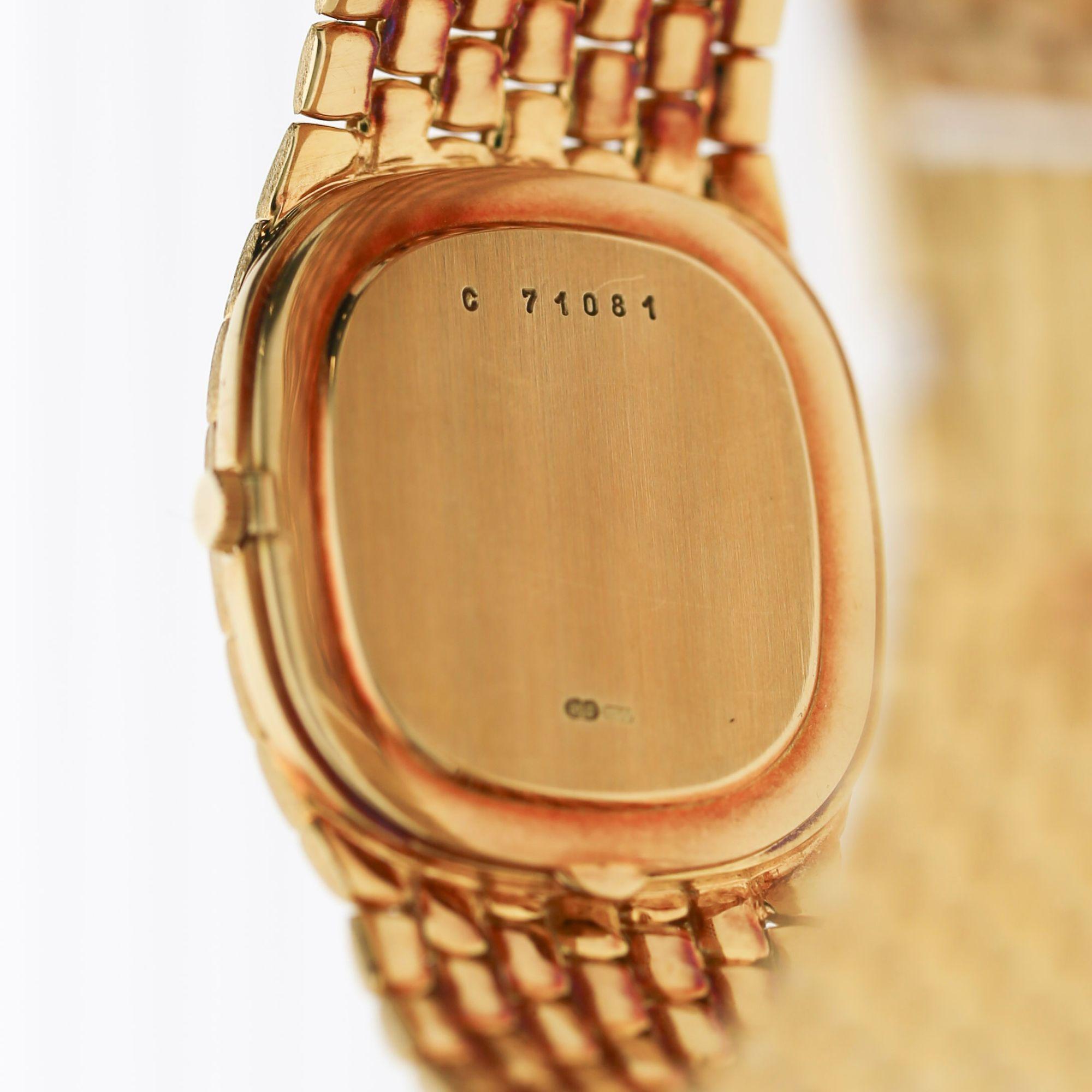 The Audemars Piguet Cobra features a distinctive cushion-shaped 18K yellow gold case that flows seamlessly into a bold, rounded beaded bracelet — one of the most architecturally striking integrated designs of the 1980s. The bracelet's polished dome-link construction gives the watch a substantial yet elegant presence on the wrist, weighing a commanding 81 grams of solid yellow gold. The smooth plain bezel frames the dial cleanly, allowing the diamond details to take center stage.