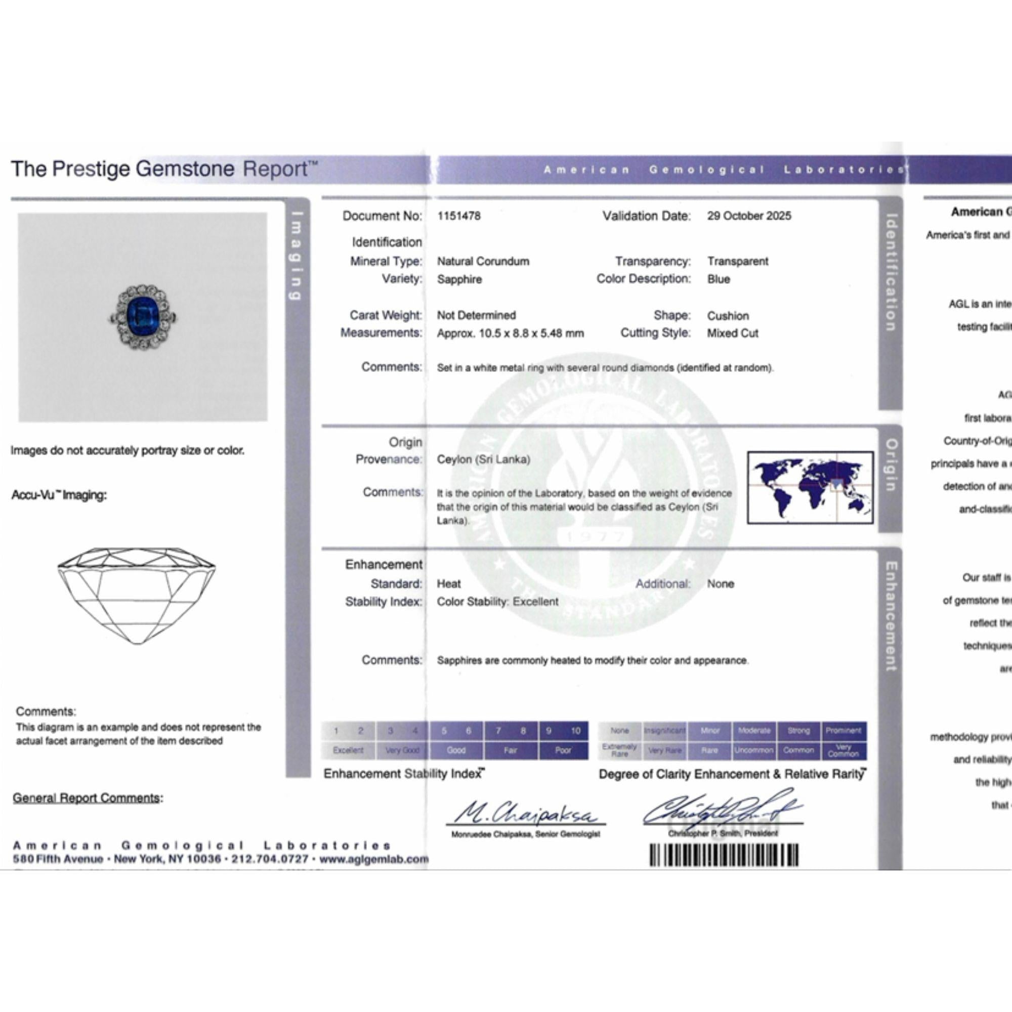 AGL-certified 5 carat cushion cut Ceylon Blue Sapphire in platinum Art Deco cluster ring with old European cut diamond halo and filigree shoulders. Ring size 4.5, adjustable. Featuring detailed milgrain detailing.