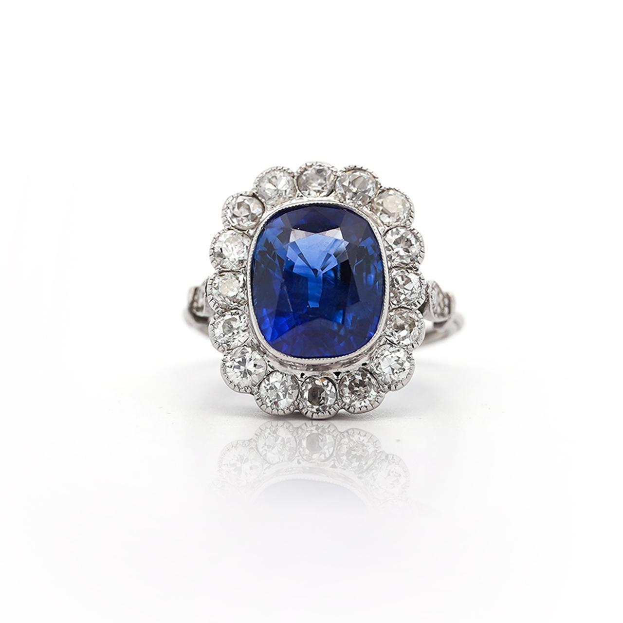 The platinum mounting showcases exemplary Art Deco craftsmanship with hand-crafted cluster design. The cushion-cut sapphire sits in a bezel setting with milgrain border, creating refined frame that protects the stone while allowing maximum light entry. A scalloped halo of old European cut diamonds surrounds the sapphire in individual collet settings, creating dimensional flower-like frame. The substantial 17.7 x 15mm ring face delivers impressive presence on the finger. Openwork filigree shoulders feature decorative metalwork that allows light to pass through while maintaining structural integrity. Milgrain beading outlines edges throughout, adding tactile texture characteristic of early 20th century fine jewelry. The platinum construction provides both durability and neutral color that enhances the sapphire's rich blue hue.