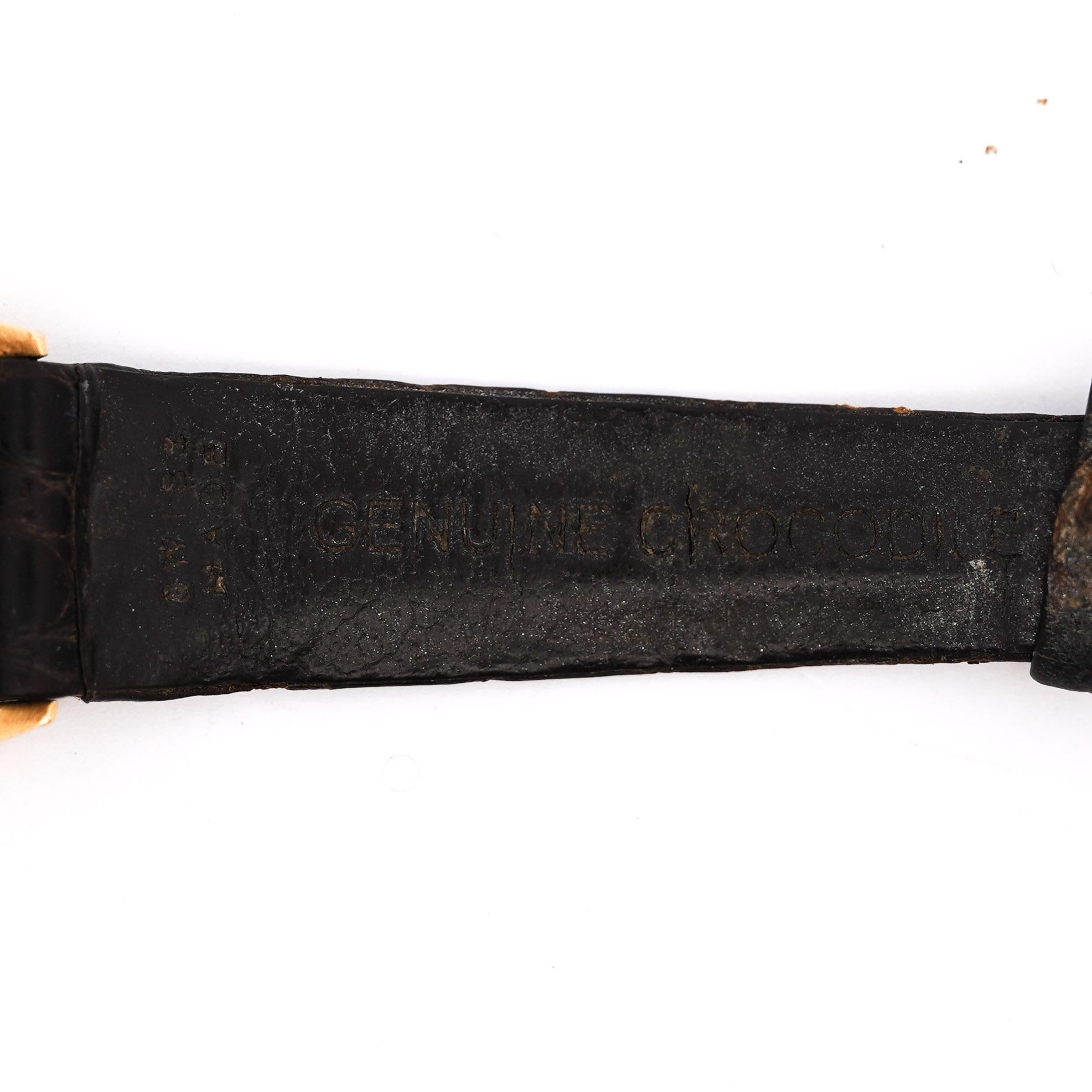 Vintage 1995 Rolex Cellini manual-wind in 18K yellow gold featuring a 25mm round case with champagne sunburst dial and applied baton hour markers. Complete with black crocodile-embossed leather strap, reference 4129, weighing 24.5 grams total.