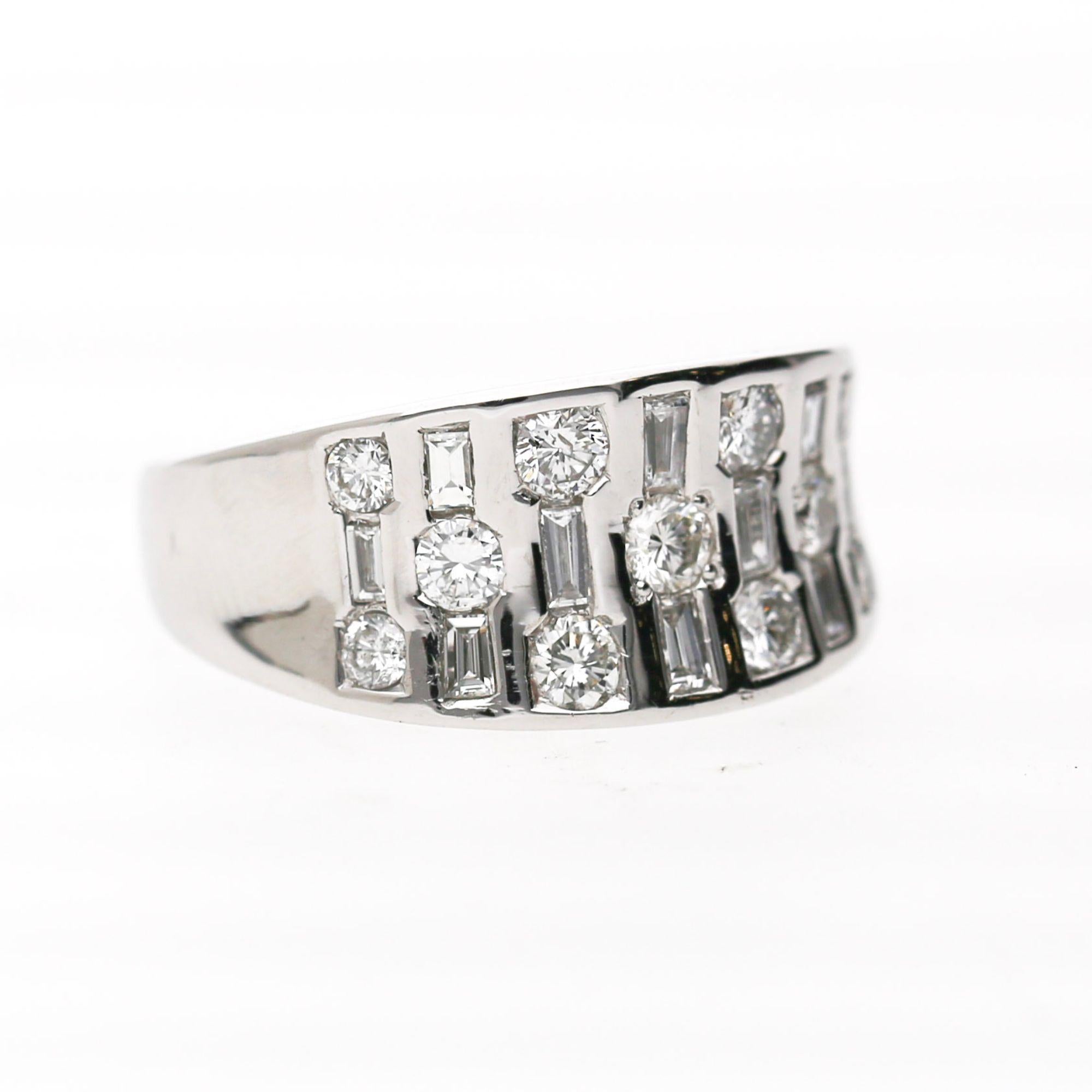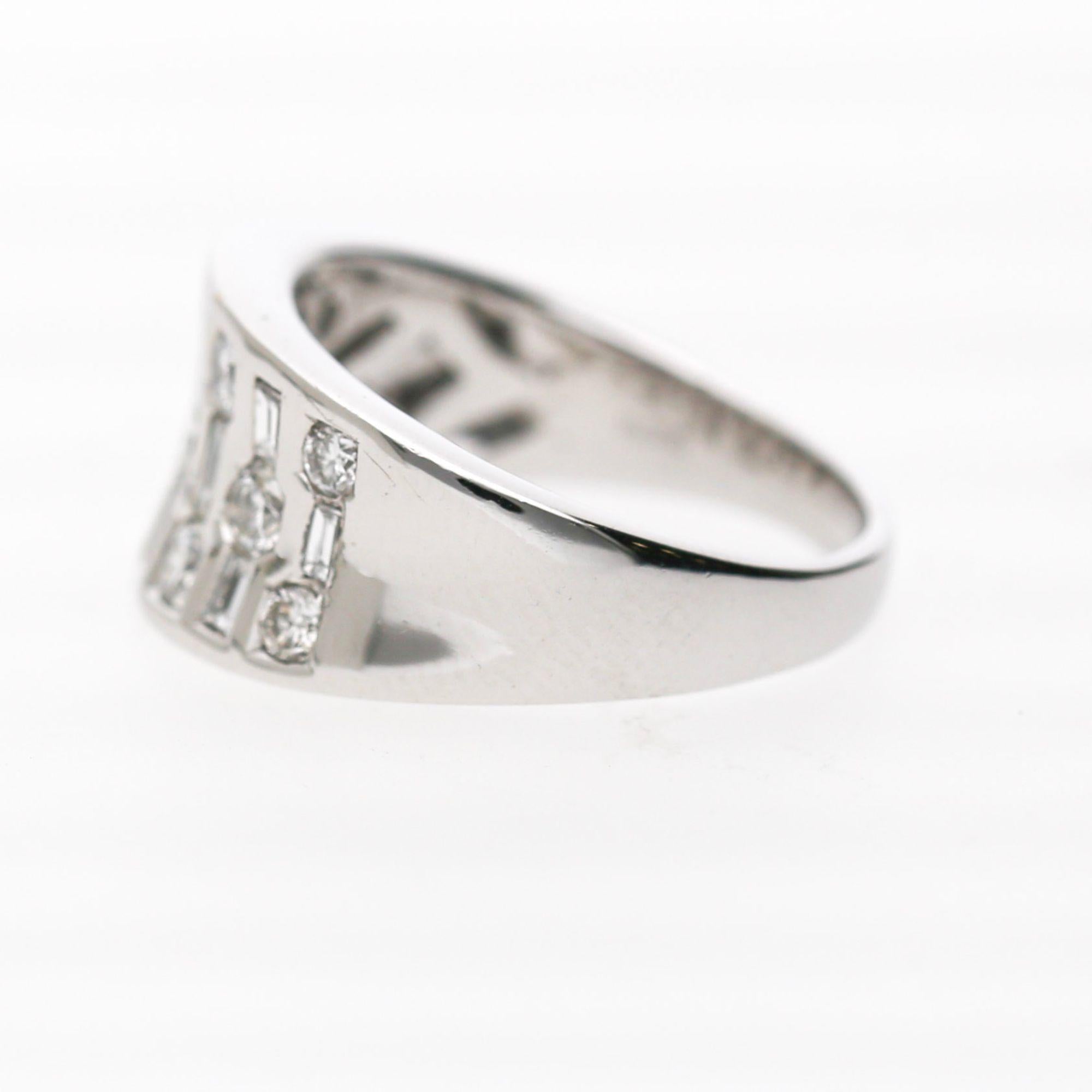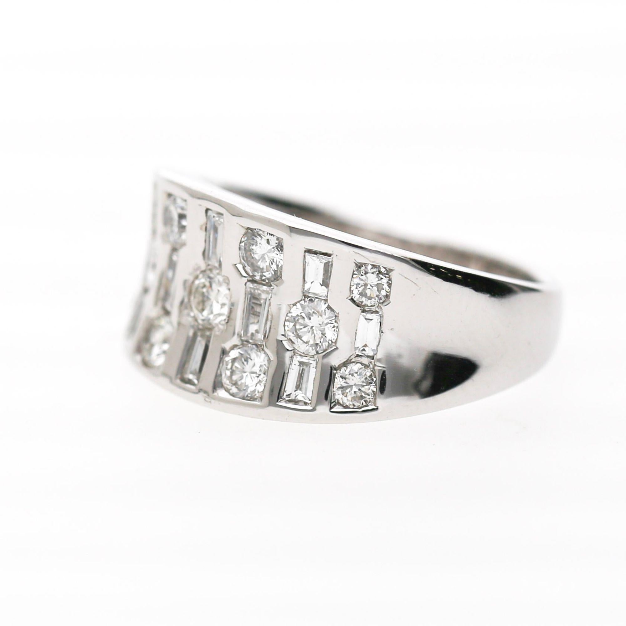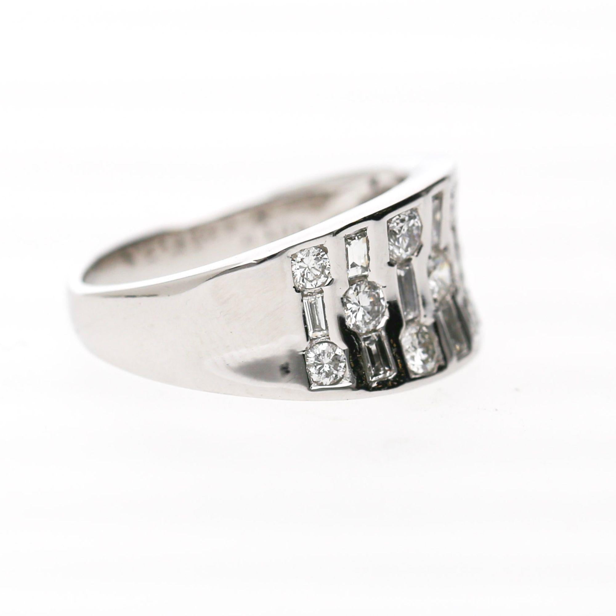 The wide band features three parallel vertical rows with alternating round brilliant and baguette diamonds. Each vertical bar contains channel-set stones creating striped pattern across face. The platinum 900 construction provides substantial weight at 10.42 grams. The design creates modern geometric appearance with continuous diamond coverage.