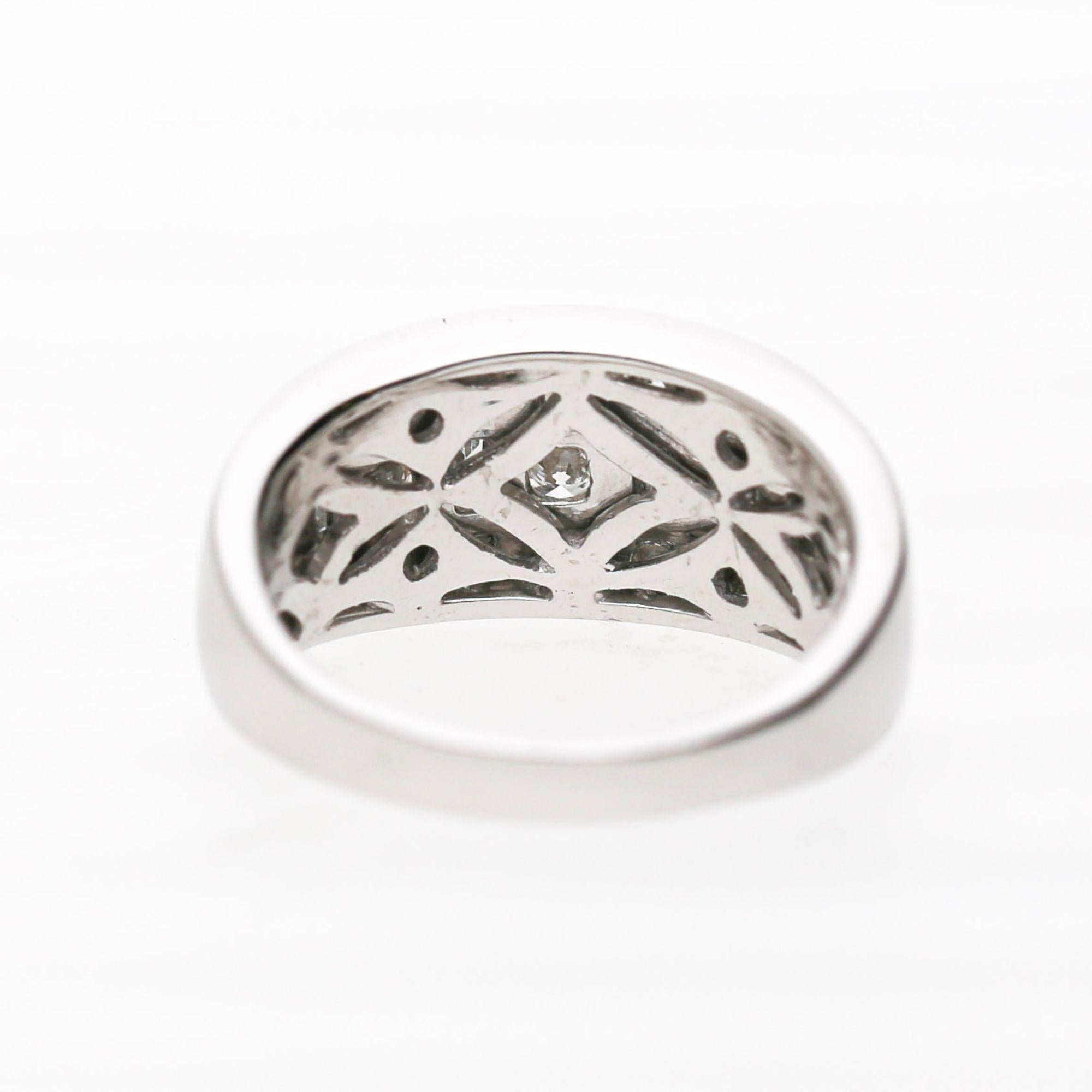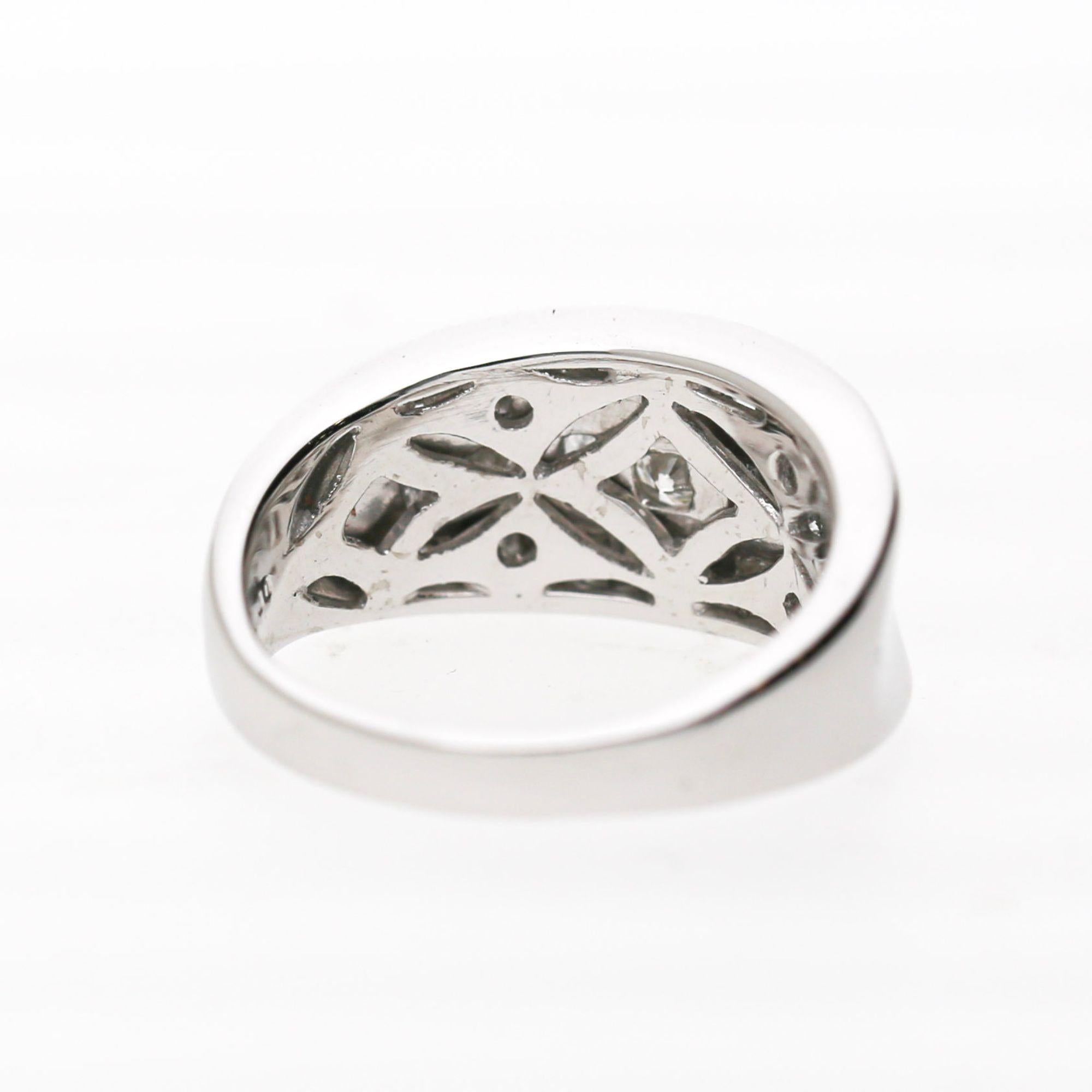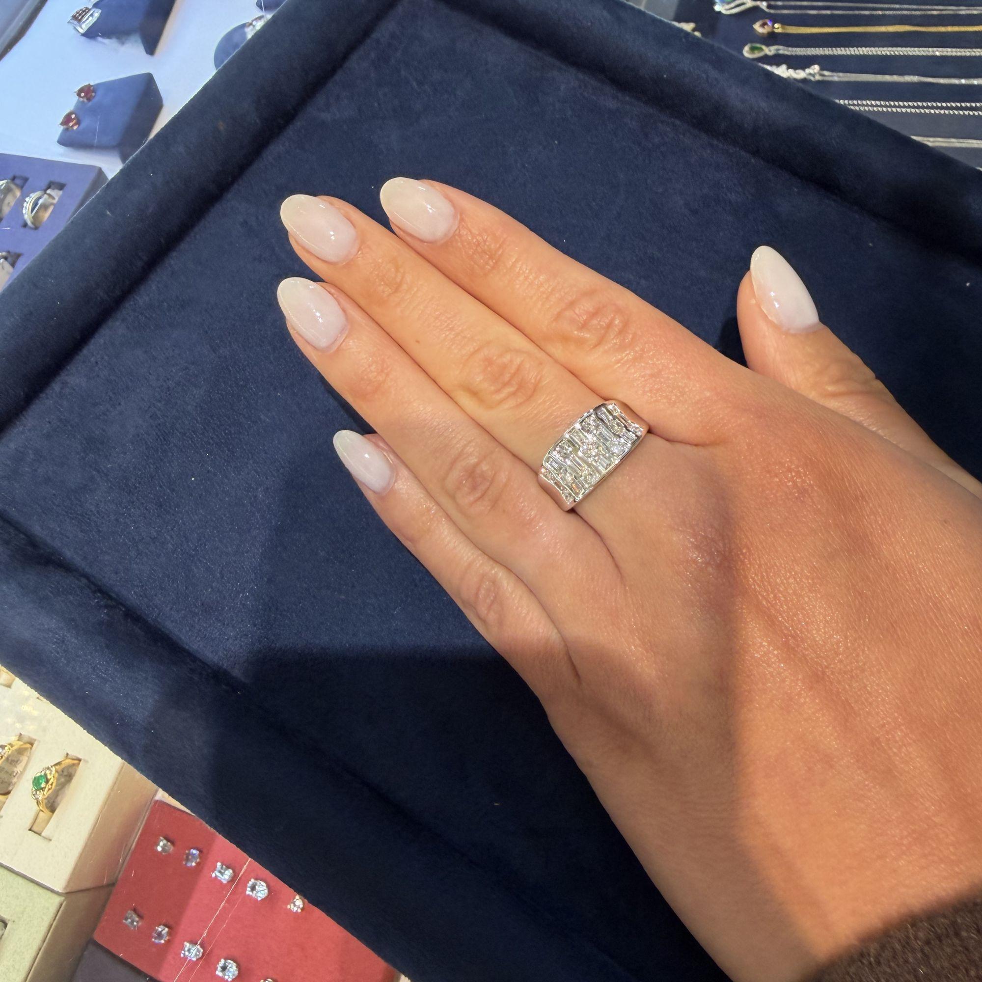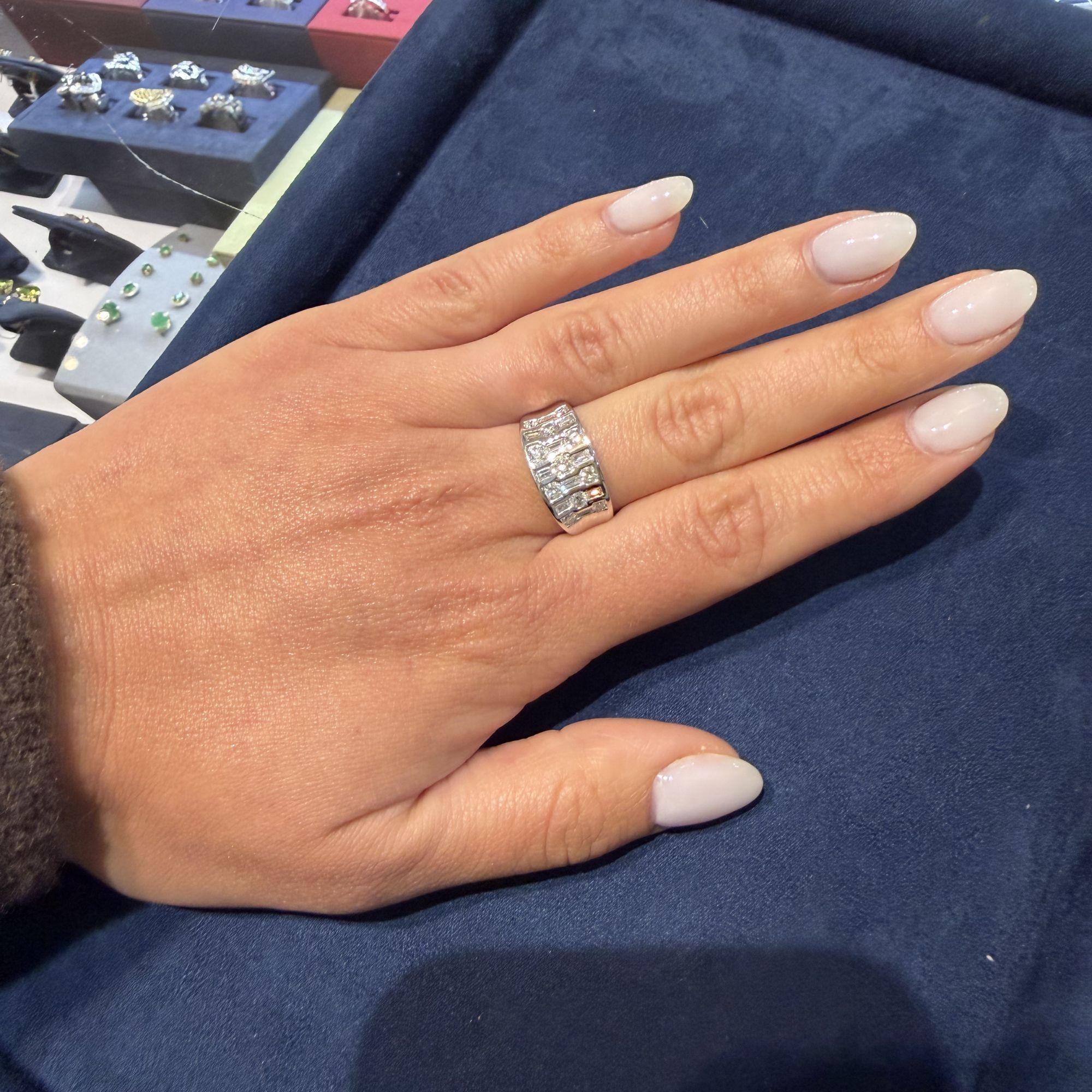 The wide band features three parallel vertical rows with alternating round brilliant and baguette diamonds. Each vertical bar contains channel-set stones creating striped pattern across face. The platinum 900 construction provides substantial weight at 10.42 grams. The design creates modern geometric appearance with continuous diamond coverage.