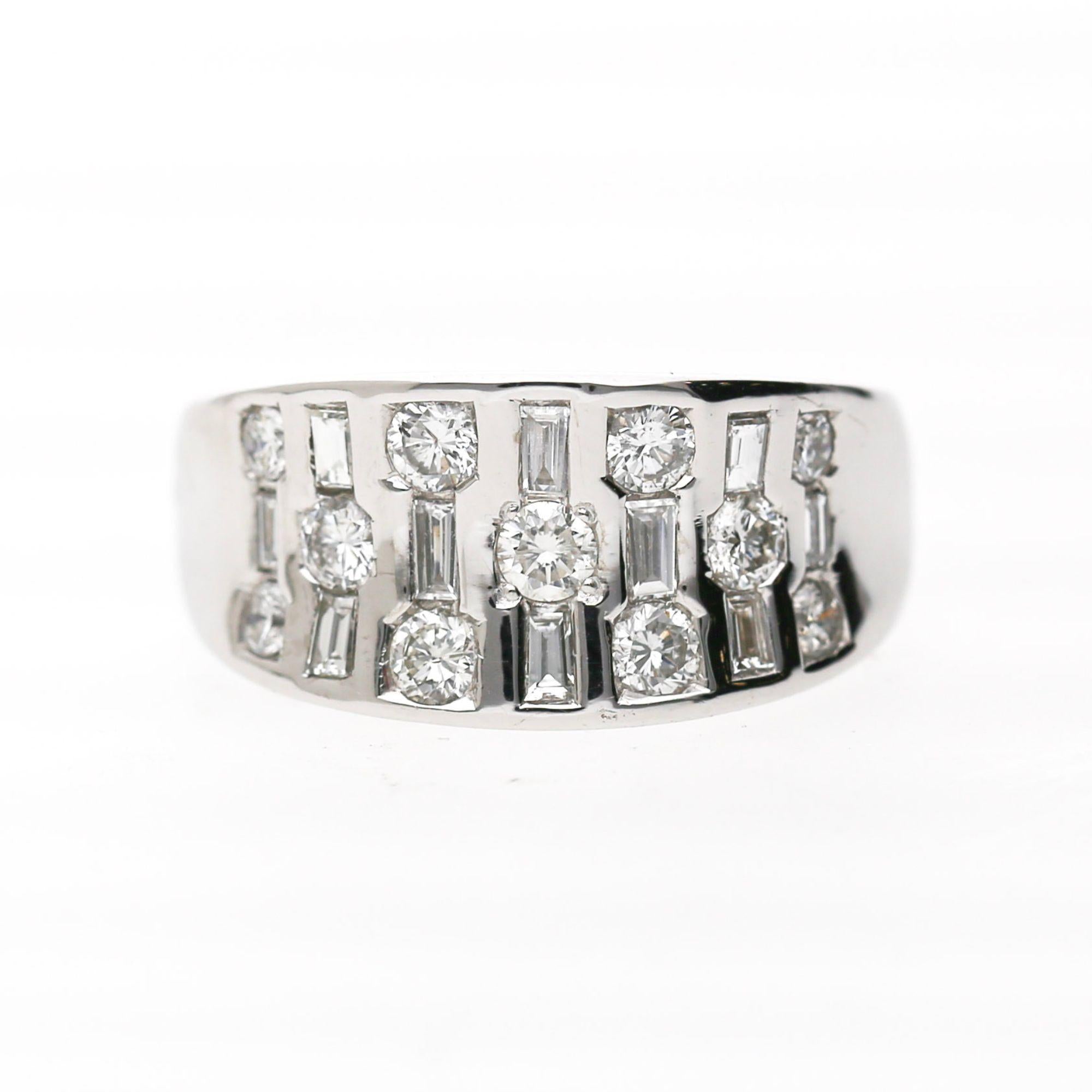 Natural Round brilliant and baguette diamond band ring in platinum 900 featuring alternating vertical bars of round and baguette diamonds in three-row design. Totaling 1.00 carat with 14 round brilliants and 10 baguettes, size 7 adjustable, weighing 10.42 grams.
