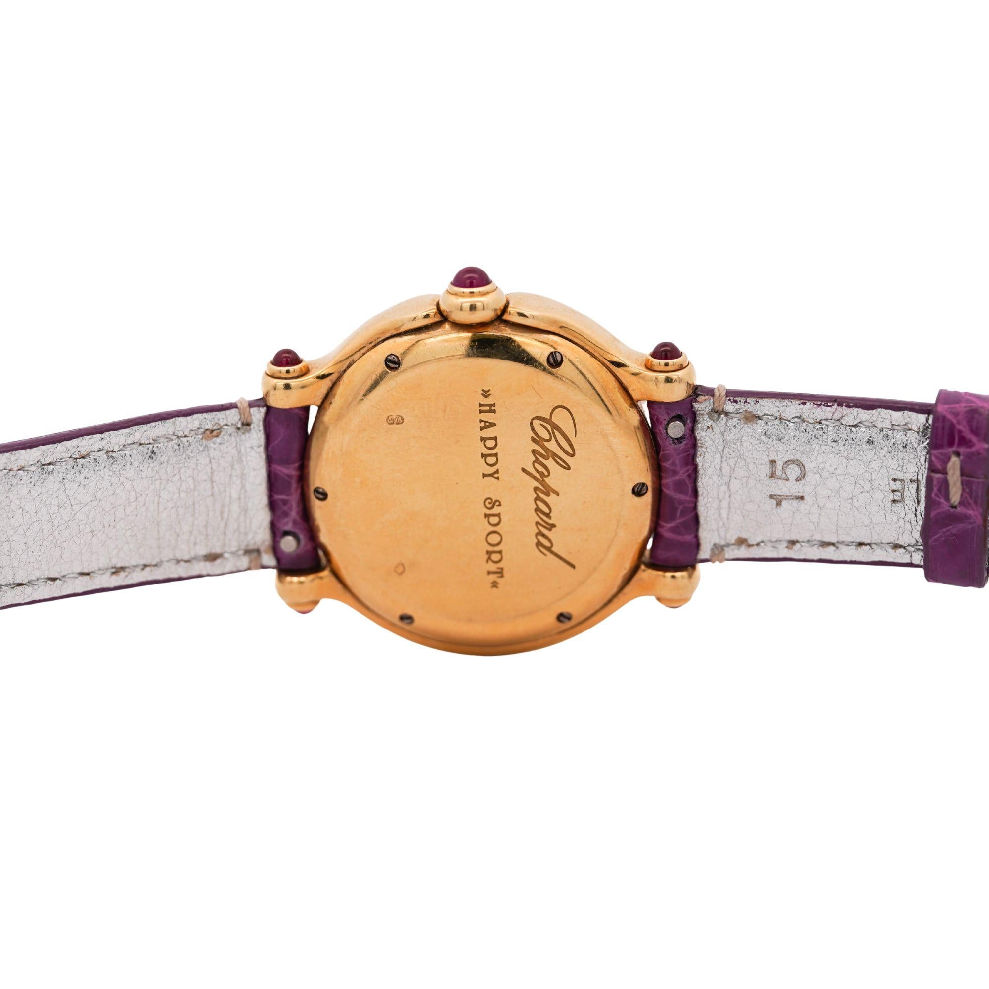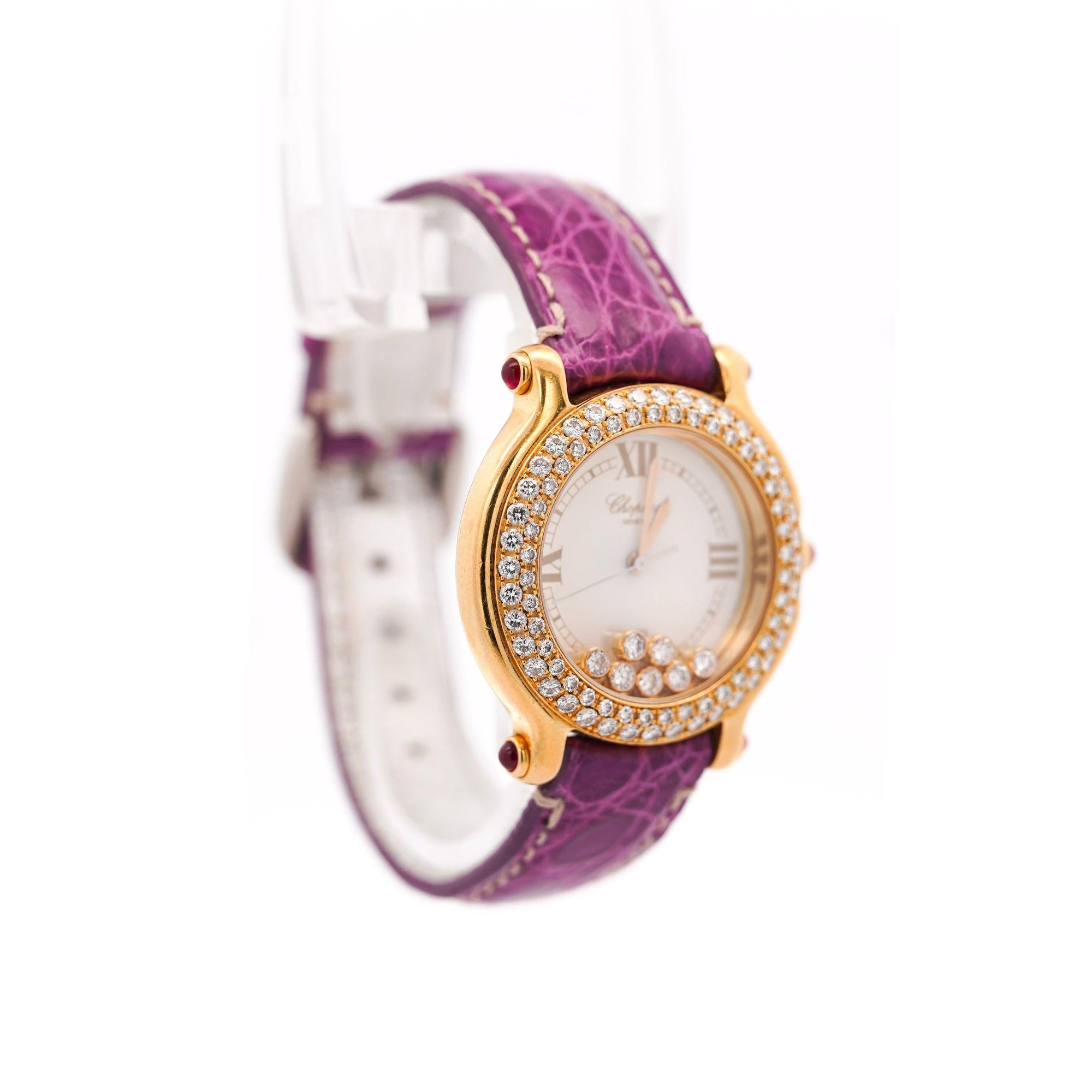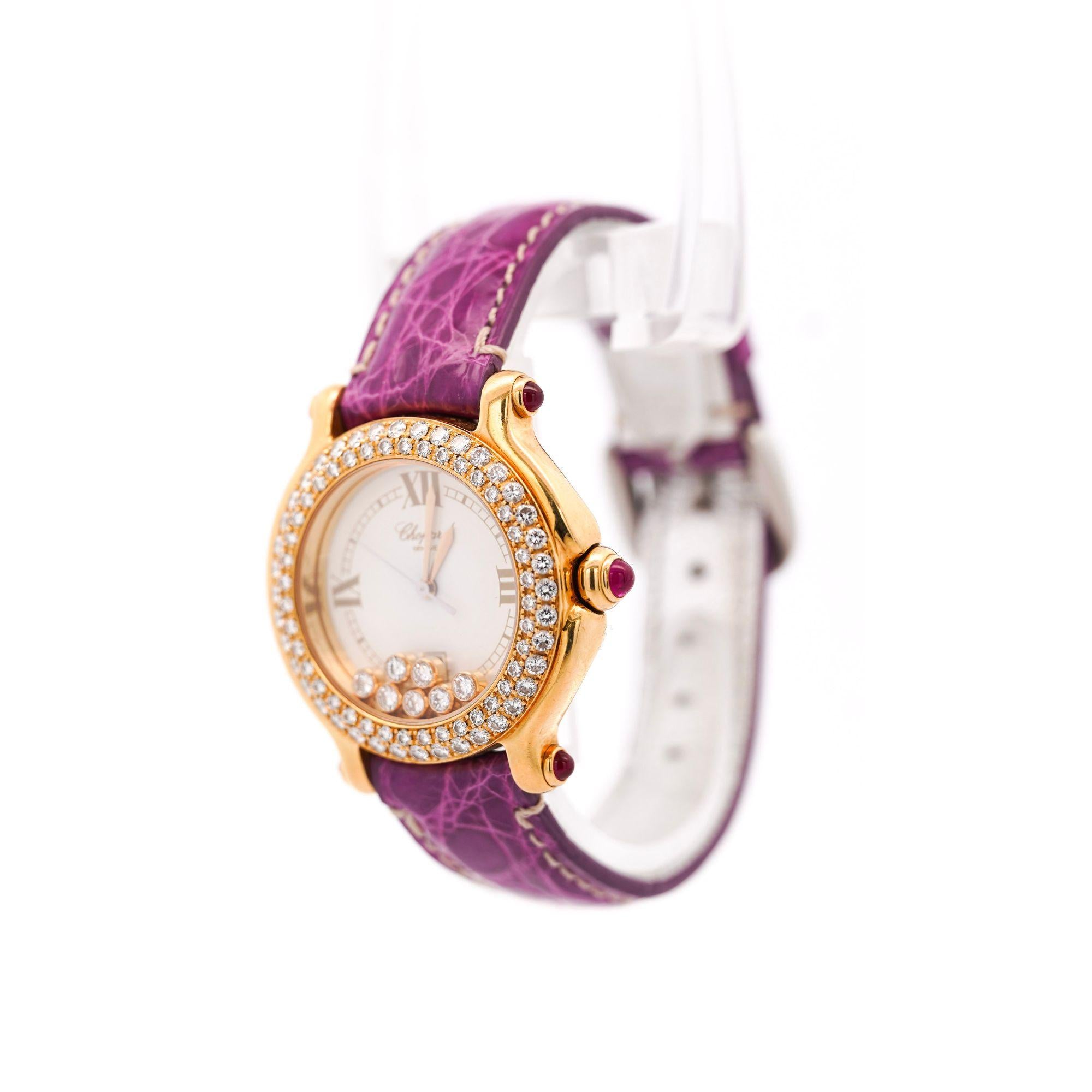 Chopard Happy Sport featuring white dial with floating diamonds in 18K yellow gold 32mm case with diamond-set bezel and ruby crystal and lugs. Quartz movement on purple leather strap signed Coach, weighing 56 grams, fits 7.5-inch wrist, includes original Chopard box.