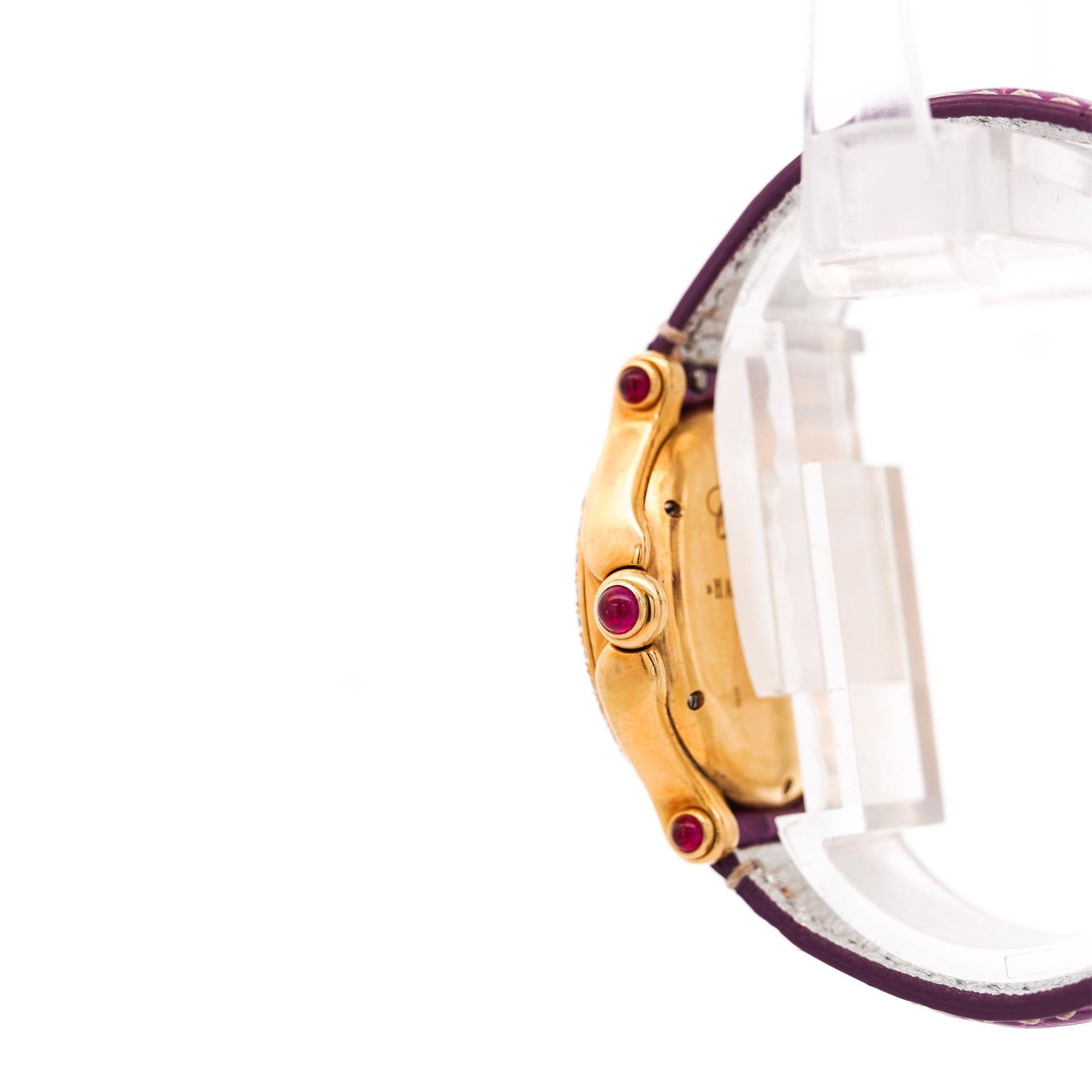 Design & Construction The 32mm round case features 18K yellow gold construction with full diamond pavé bezel surrounding the white dial. The ruby crystal crowns the winding stem while ruby cabochons accent the integrated lugs, providing vibrant red color contrast against the yellow gold. Chopard's signature floating diamonds move freely within the dial chamber, creating dynamic sparkle with wrist motion. The white dial displays gold Roman numeral hour markers with matching gold hands. Purple crocodile-embossed leather strap signed "Coach" features contrast stitching and connects through integrated lugs with ruby accents.