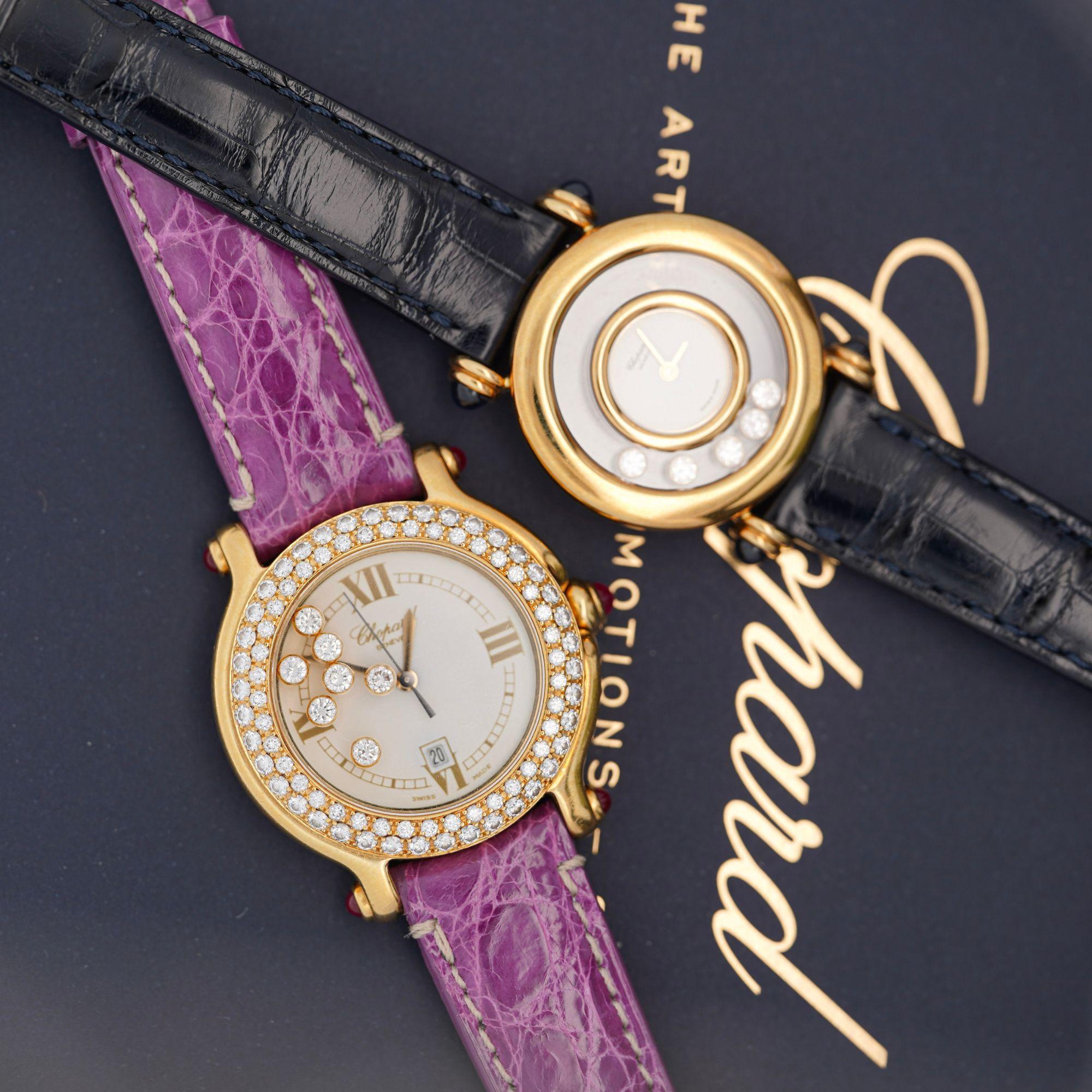 About Chopard Happy Sport Chopard's Happy Sport collection combines the maison's innovative floating diamond technology with sporty elegance. The floating diamonds move between sapphire crystals, capturing light with every movement. Reference 4144 showcases substantial diamond bezel work and distinctive ruby accents on both the crown and lugs. At 56 grams in solid 18K yellow gold with diamond-set bezel, this watch delivers luxury presence. Complete with original Chopard box for authenticated provenance.