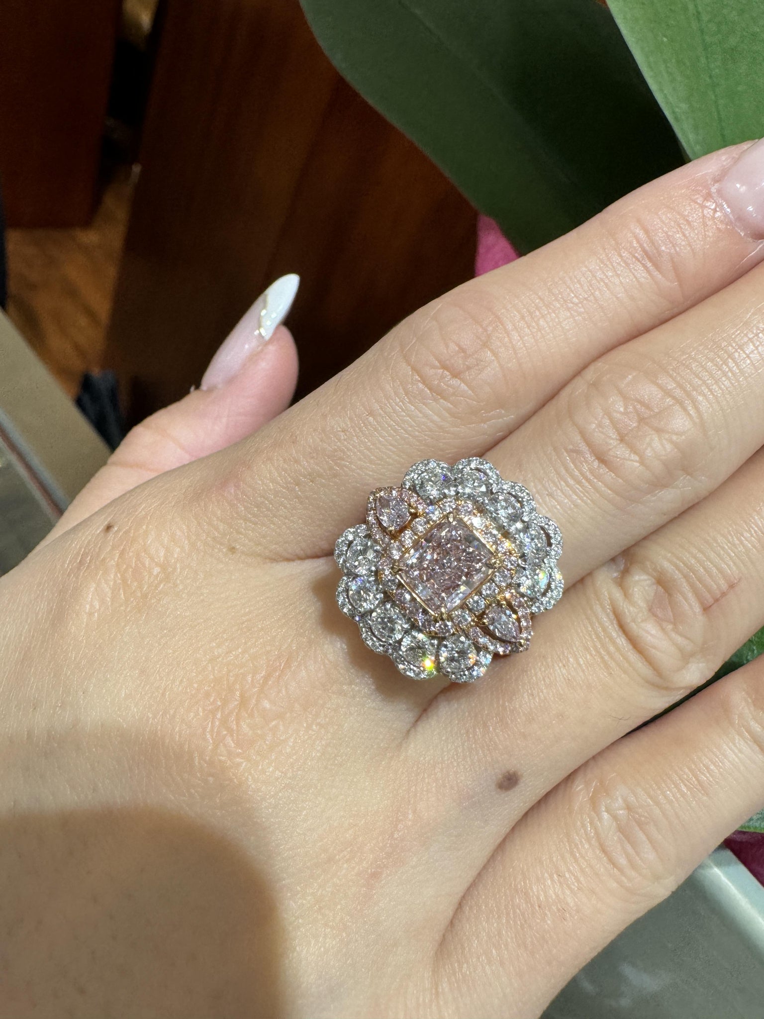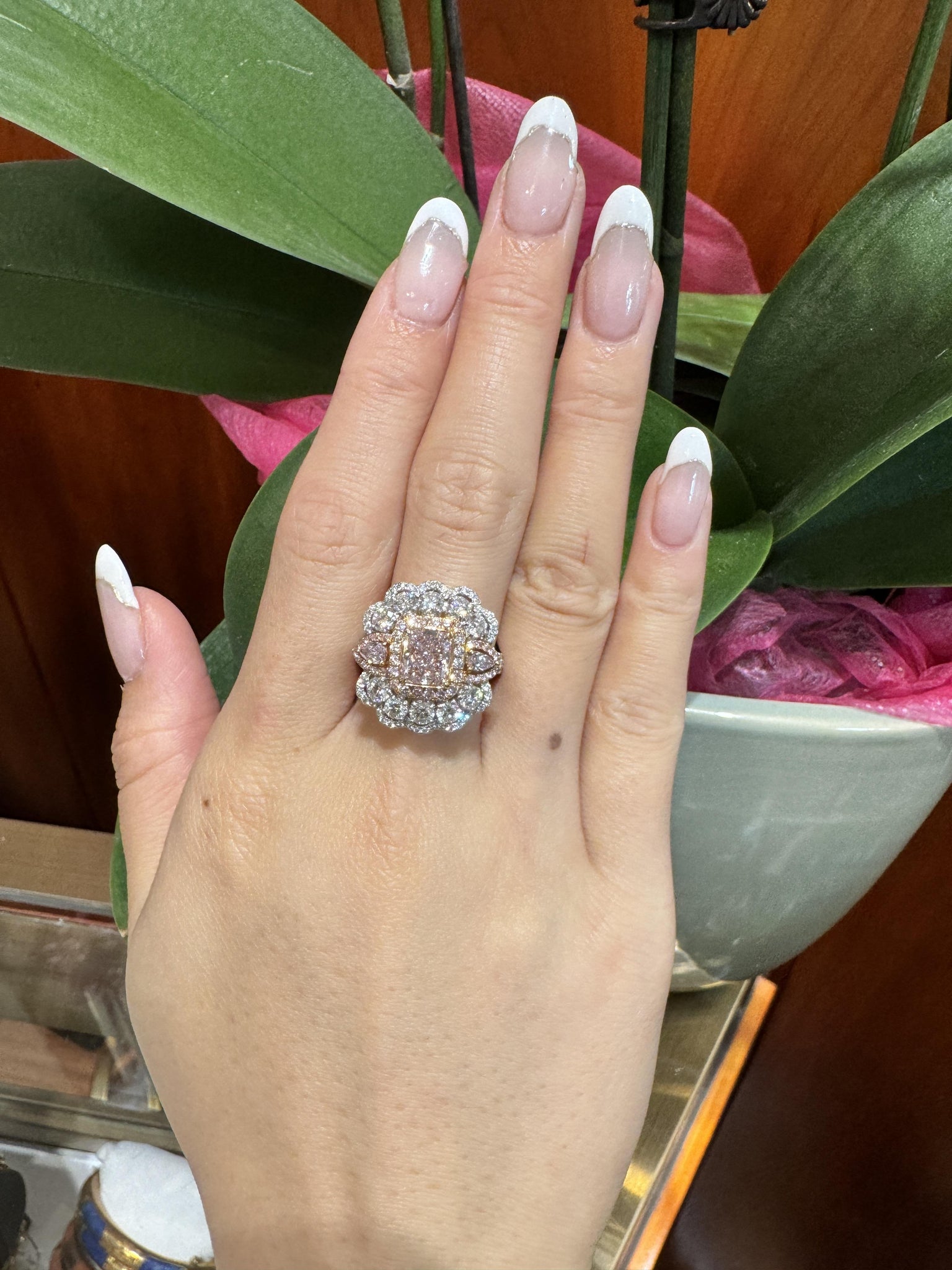 The two-tone gold setting strategically employs rose gold wherever pink diamonds are placed to enhance their color saturation, while white gold frames the white diamond accents for maximum brilliance and contrast. The scalloped halo design features alternating lobes of pink and white diamonds, creating a flower-like pattern that frames the center stone with dimensional sparkle. Two horizontally-set pear-cut pink diamonds flank the center stone on each side, adding architectural interest and color continuity. The heavily pavé-set split shank features 96 white diamonds that taper elegantly toward the finger, with rose gold prongs securing pink diamonds and white gold prongs holding white diamonds throughout for optimal color presentation.